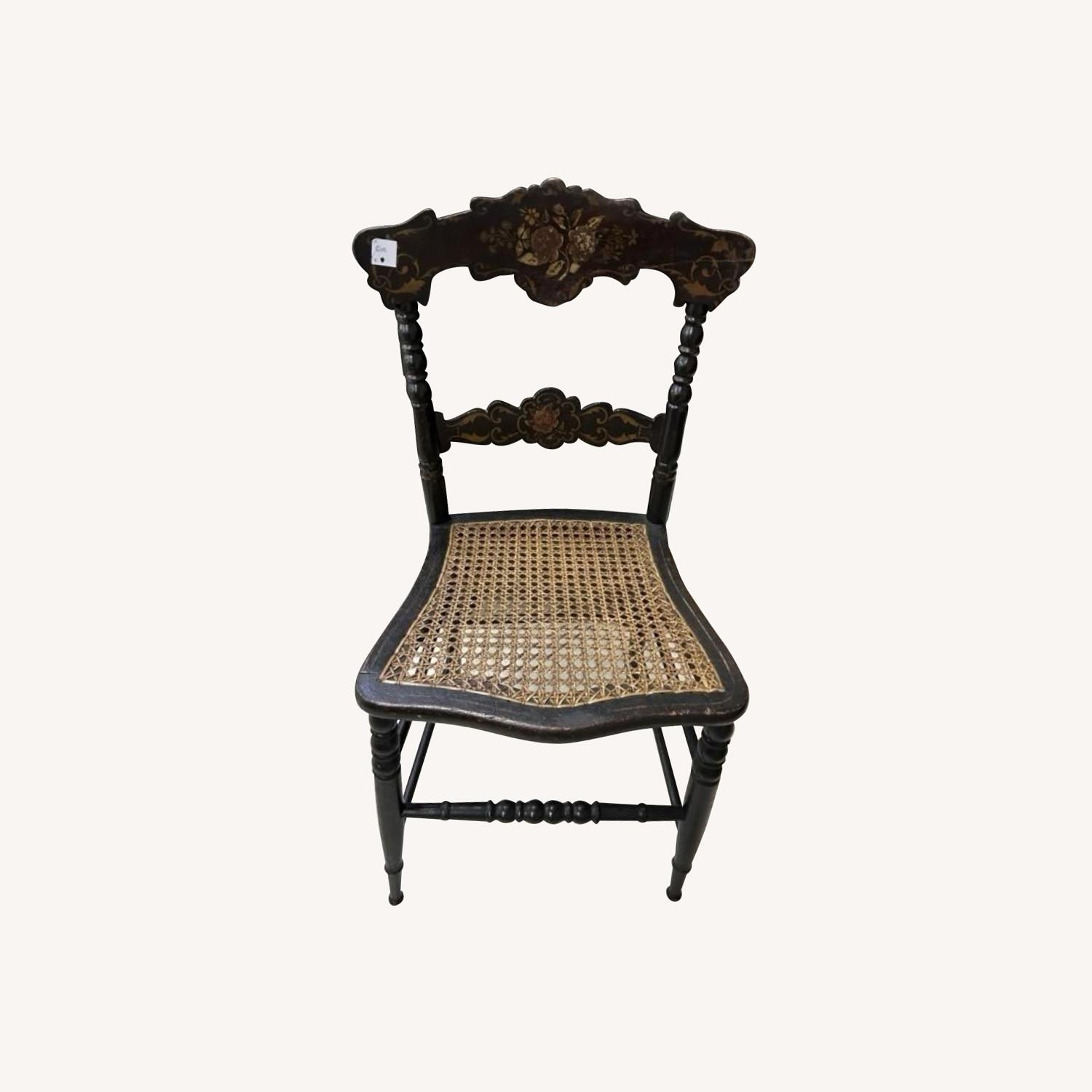 Seller's Notes:1 single Hitchcock accent chair, color black with hand painted on the ladder. Has cane seat Chair is good condition