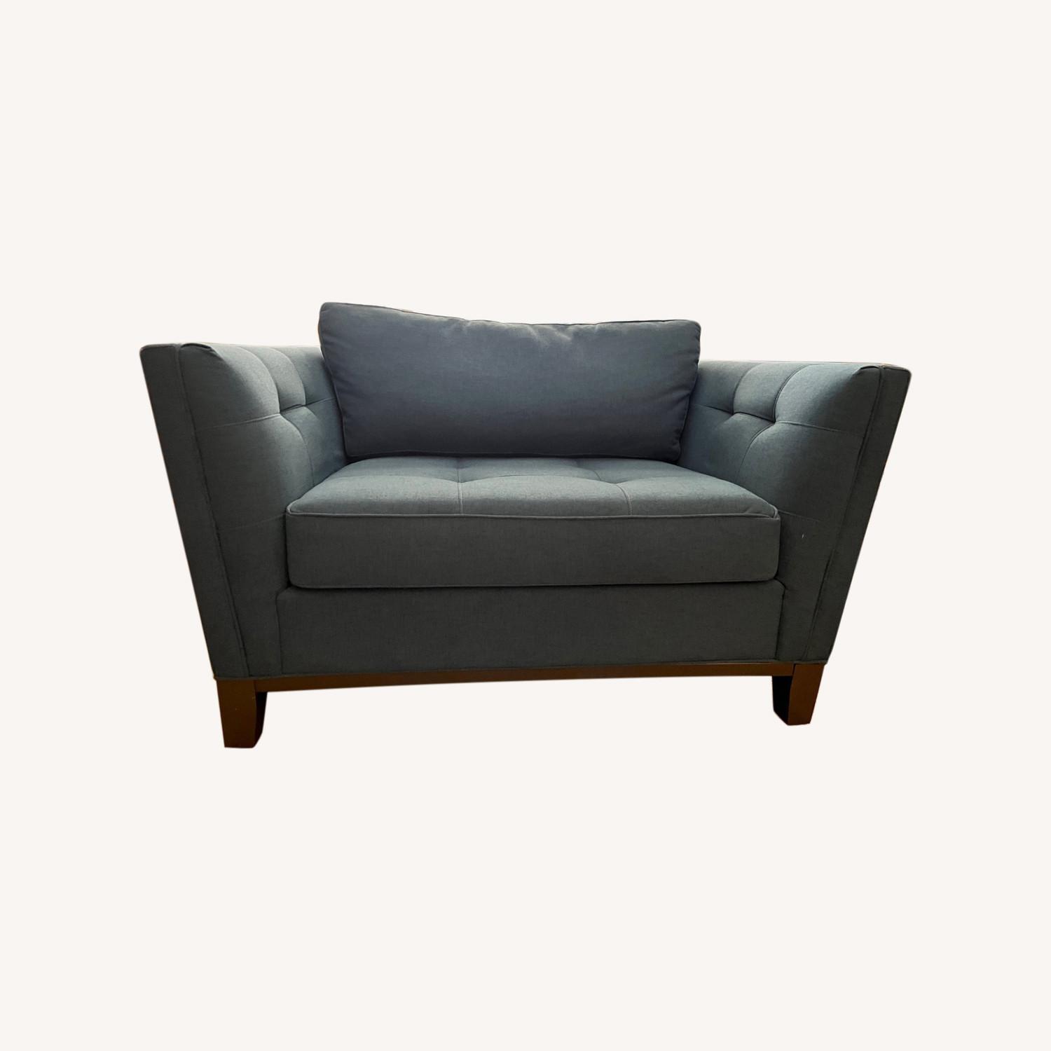 Seller's Notes:Wider than a single chair but not as wide as a love-seat, this Chair-and-a-Half very comfortably fits two people and is also great for curling up by yourself with a good book! Barely used, almost new, sturdy, modern furniture with great color!