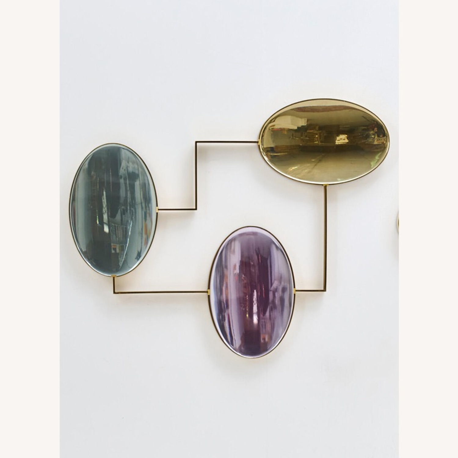 For the Aurora Wall Composition, McCollin Bryan reimagined their iconic Lens Table into a dazzling work of art. The geometric metal frame is accentuated with elegant discs made of the same highly polished resin backed with tinted mirror—which are offered in monochrome or mixed combinations of jewel tones reminiscent of gemstones. Whether hung vertically or horizontally, the composition will add bold sculptural appeal.