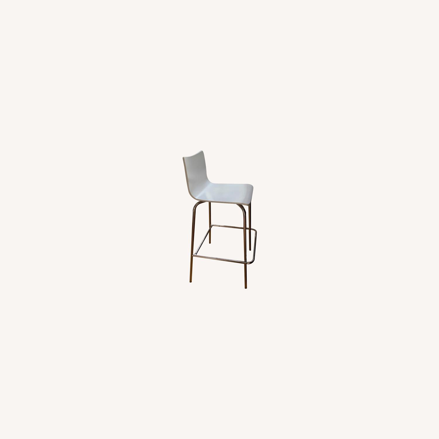Seller's Notes:White finish w/ chrome base and contemporary, low-back design Overall: 19" W x 21" D x 38" H (each); Seat: 14.5" W x 14" D x 29.25" H; Backrest: 13.25" W x 10" H; Footrest: 11" H; Clearance: 17.5" W x 17.5" D x 10.5" H Materials: bentwood, metal; Supports up to: 250 lb. (per stool); Approx. weight: 26 lb. Sturdy yet comfortable bentwood form with waterfall seat edge takes it easy on legs.