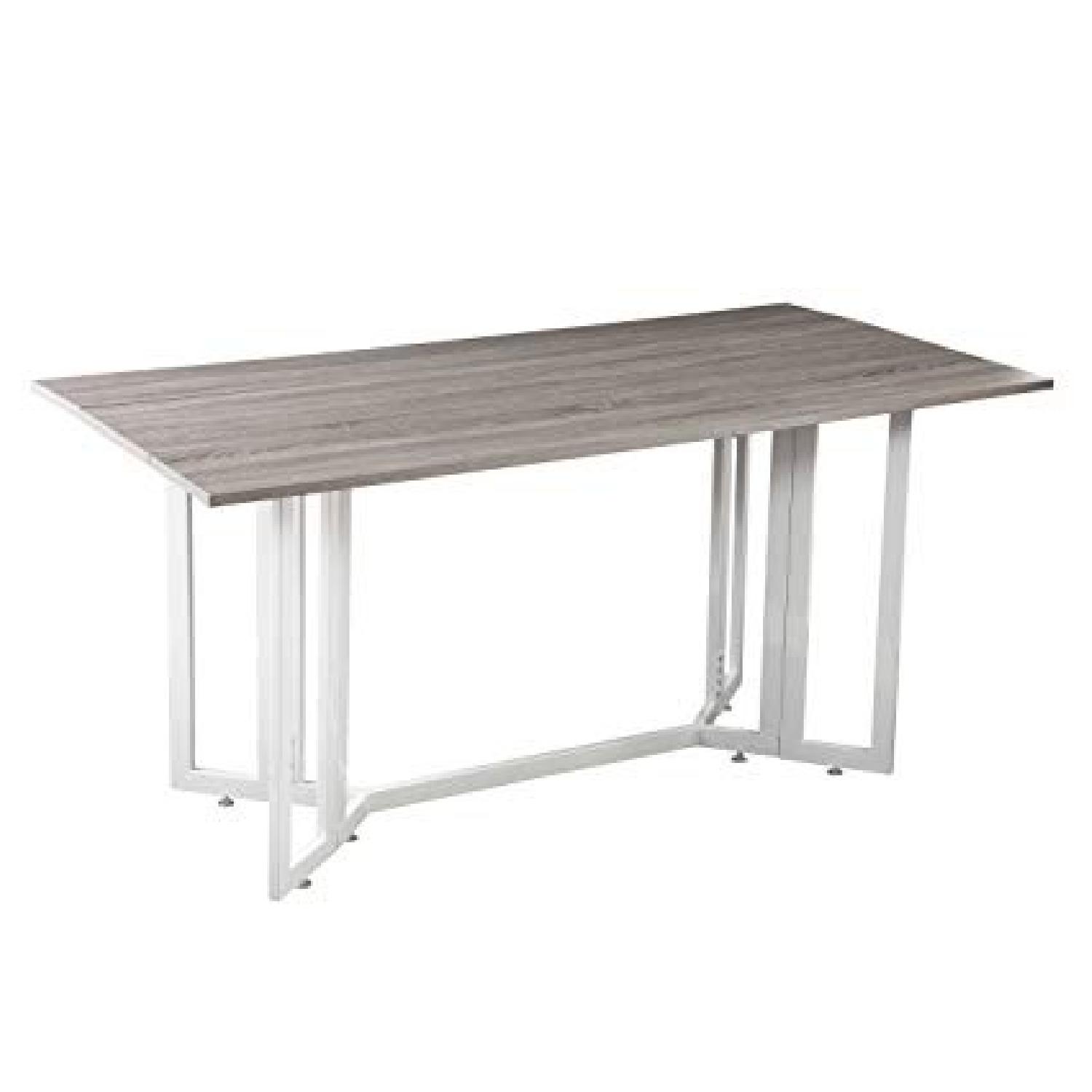 Seller's Notes:Drop Leaf Table that opens up as a dining table or closes as a console table. It's perfect for small or limited spaces. So functional and beautiful!! This table is BRAND NEW, still in its original box. I accidently bought two and can't return the second one. The pictures represent my own. This multifunctional table has been a dream for a New York apartment. The top is gray and the legs are white metal. 63 inches wide x 31.5 inches deep (dining) / 63inches wide x 12.25 inches deep (console)