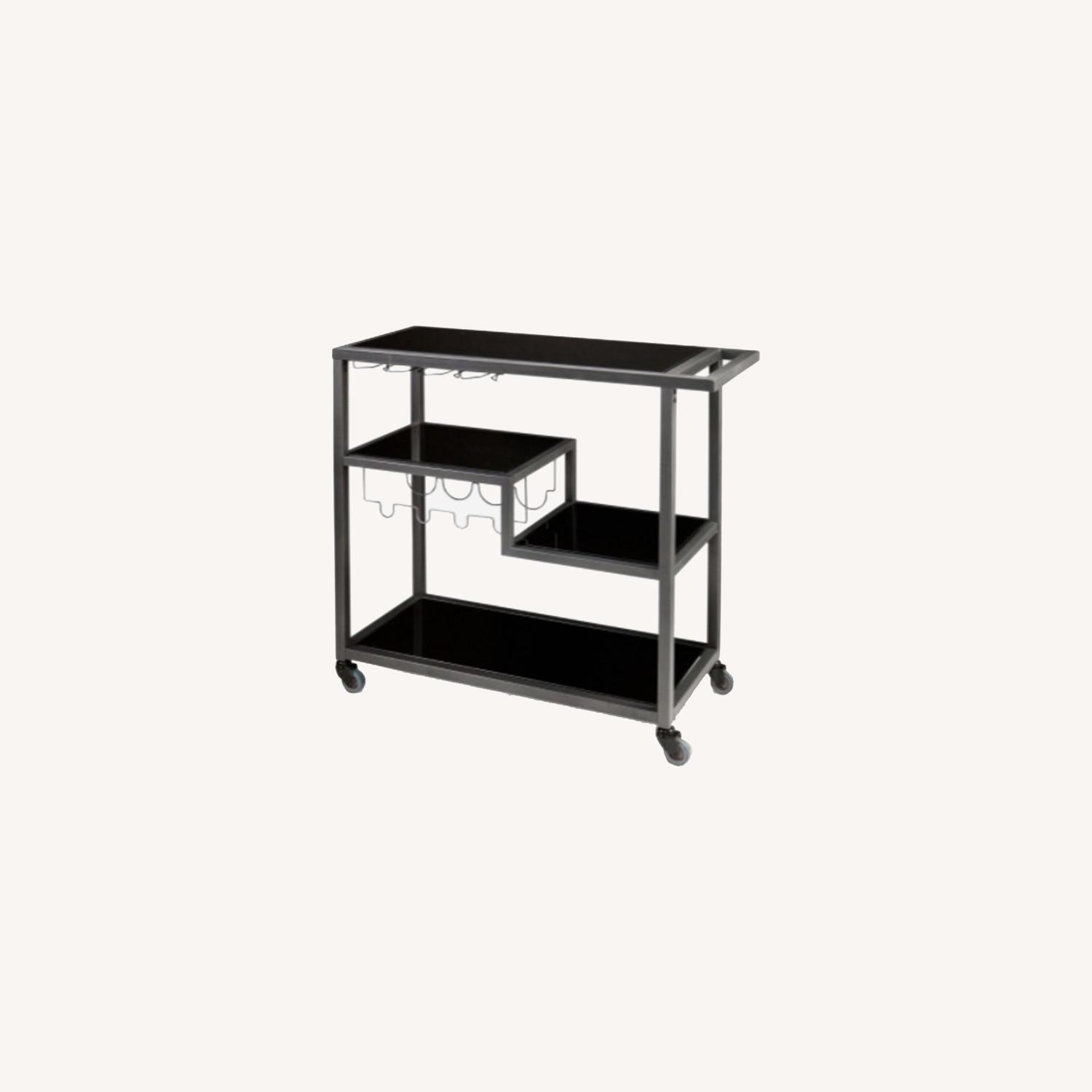 Seller's Notes:The frame has tempered glass shelves to display items. Wine bottle and stemware storage for glasses. Locking casters and a sturdy handle so you can roll the bar cart out of sight when you don't need it anymore. We're moving and no longer can fit this nifty item! Materials: Powder-Coated Iron, 5mm Smoked Mirror, Powder-Coated Metal Tube, Iron Line, 5mm Tempered Glass Origin: Imported Dimensions: 40 x 16 x 37.25 in. Brand: Holly & Martin