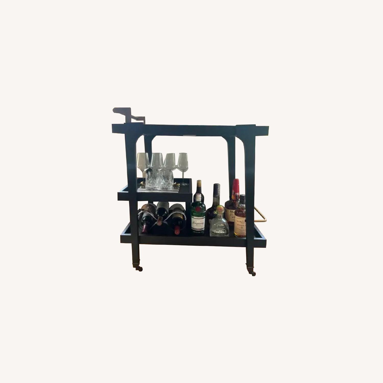 Seller's Notes:Serve up center-stage style with the Holly & Martin Zhori Midcentury Modern Bar Cart. This drink cart's black and aged brass, open shelving, and locking castors will stop traffic at your next soiree. Named the number one bar cart of the year! In perfect condition.