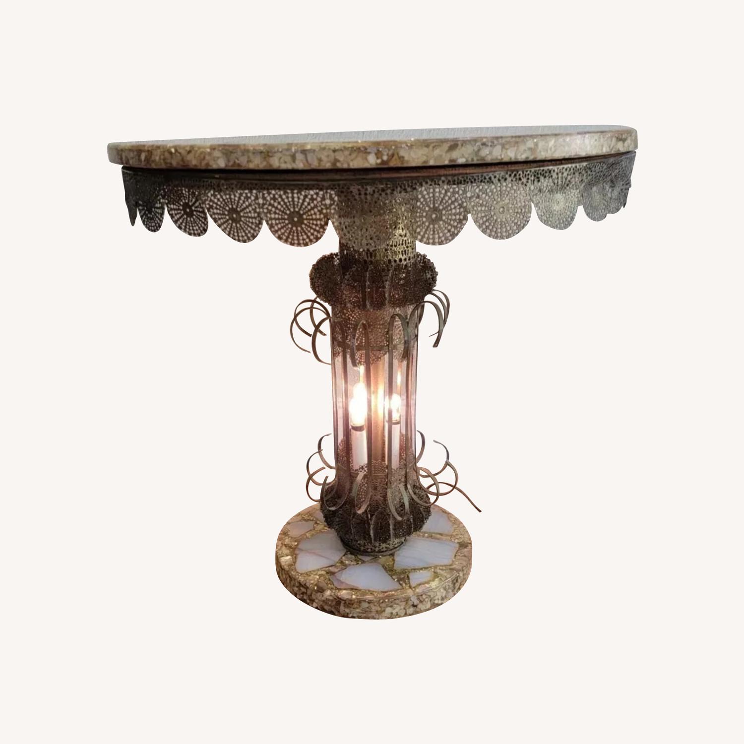 Seller's Notes:This vintage Arturo Pani style side cocktail table exudes elegance and sophistication. Its stunning design features a gold finish and resin abalone onyx material. The table is perfect for use in any art deco, Hollywood Regency or mid-century setting. Its originality makes it a rare find, and it's sure to be a standout piece in your collection. Its timeless appeal and exceptional craftsmanship make it an ideal addition to any room. No markings or signatures found on item to confirm or refute that this is an Arturo Pani piece. Please perform diligent research prior to purchase.