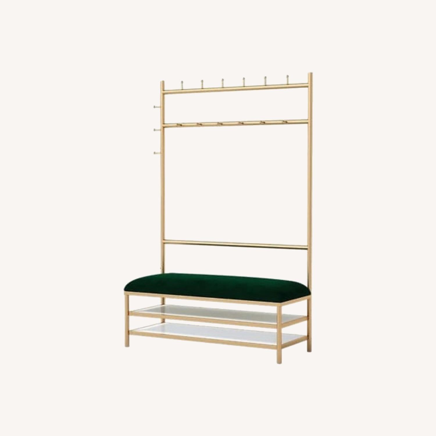 Seller's Notes:Entryway Hall Tree with Shoe Storage Bench Green Velvet Upholstered Gold Clothing Rack The colors are beautiful and it’s in great condition, we just don’t have room for it anymore! Inspired by contemporary line art, the hall tree showcases an open frame with clean lines that enhances the fashion sense of the space. There are two-tier shelves and hanging hooks that allow you to showcase your personal style. And the upholstered bench adds extra comfort while seating. It works in an entryway, hallway, and bedroom or as a coat rack in an office with limited closet space for extra coats, winter accessories, and boot storage.
