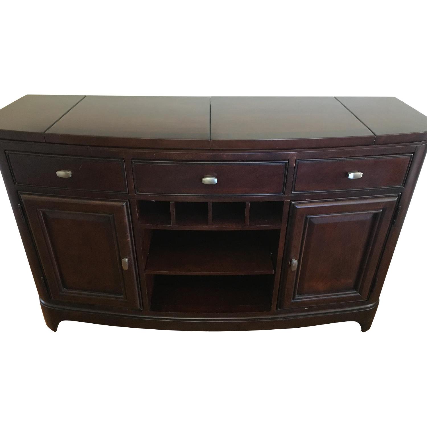 Seller's Notes:Home bar/credenza passed down from family. Three drawers, two shelving sections with doors, and open shelves with wine rack. Appears to have been manufactured in 2010 based on labels in the back (see last picture). Item is very heavy and good quality; contains considerable amount of storage space and folds outward as shown in pictures two and three. Minor scratches on the exterior from normal wear and tear. Dimensions provided are with top shelving folded in; when shelves are expanded length extends to 78" overall.