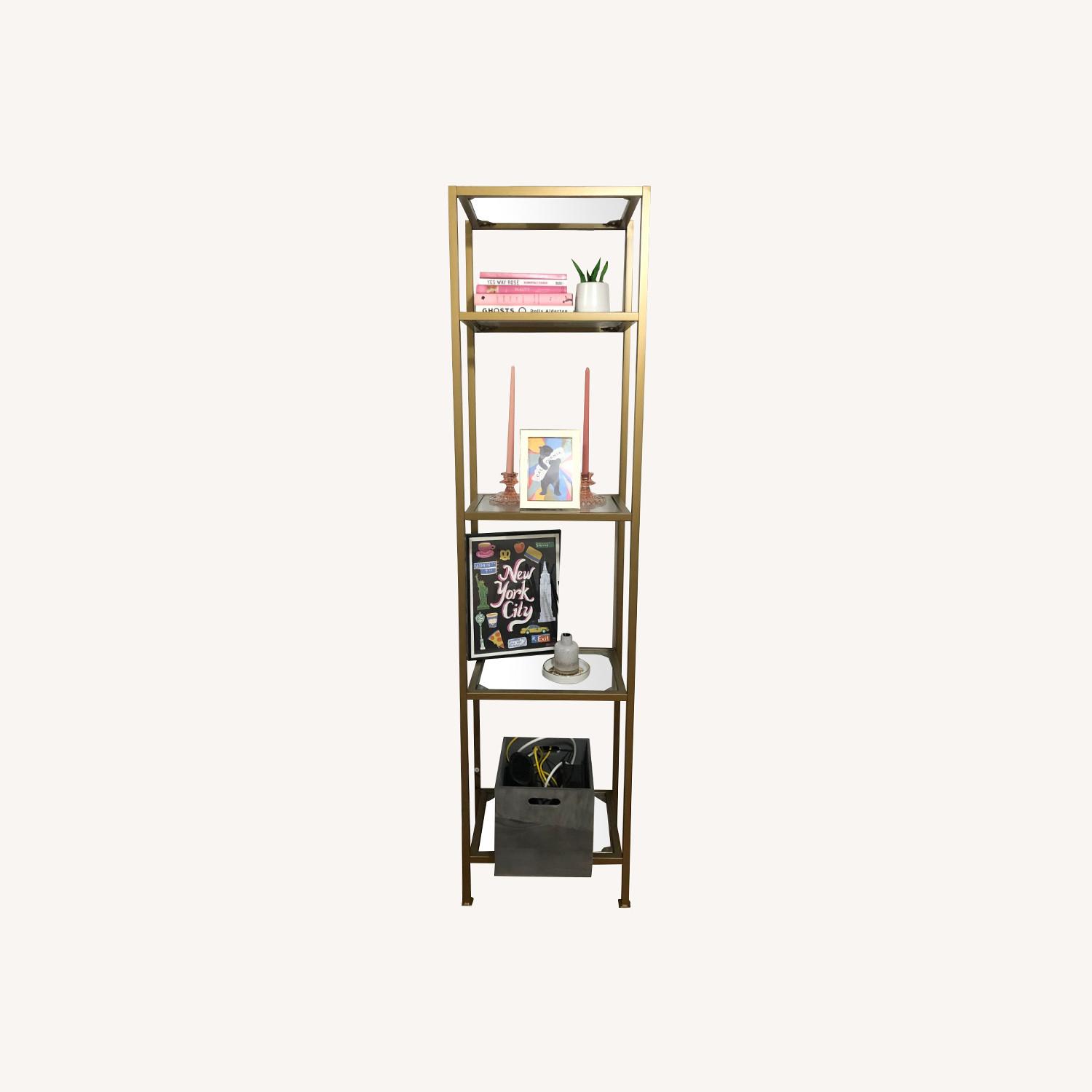 Seller's Notes:Gold and glass bookshelf from The Home Depot. There is no wear and tear on this item as I have only had it for a little over a year. The 5 shelves provide ample storage for decor in a small apt.