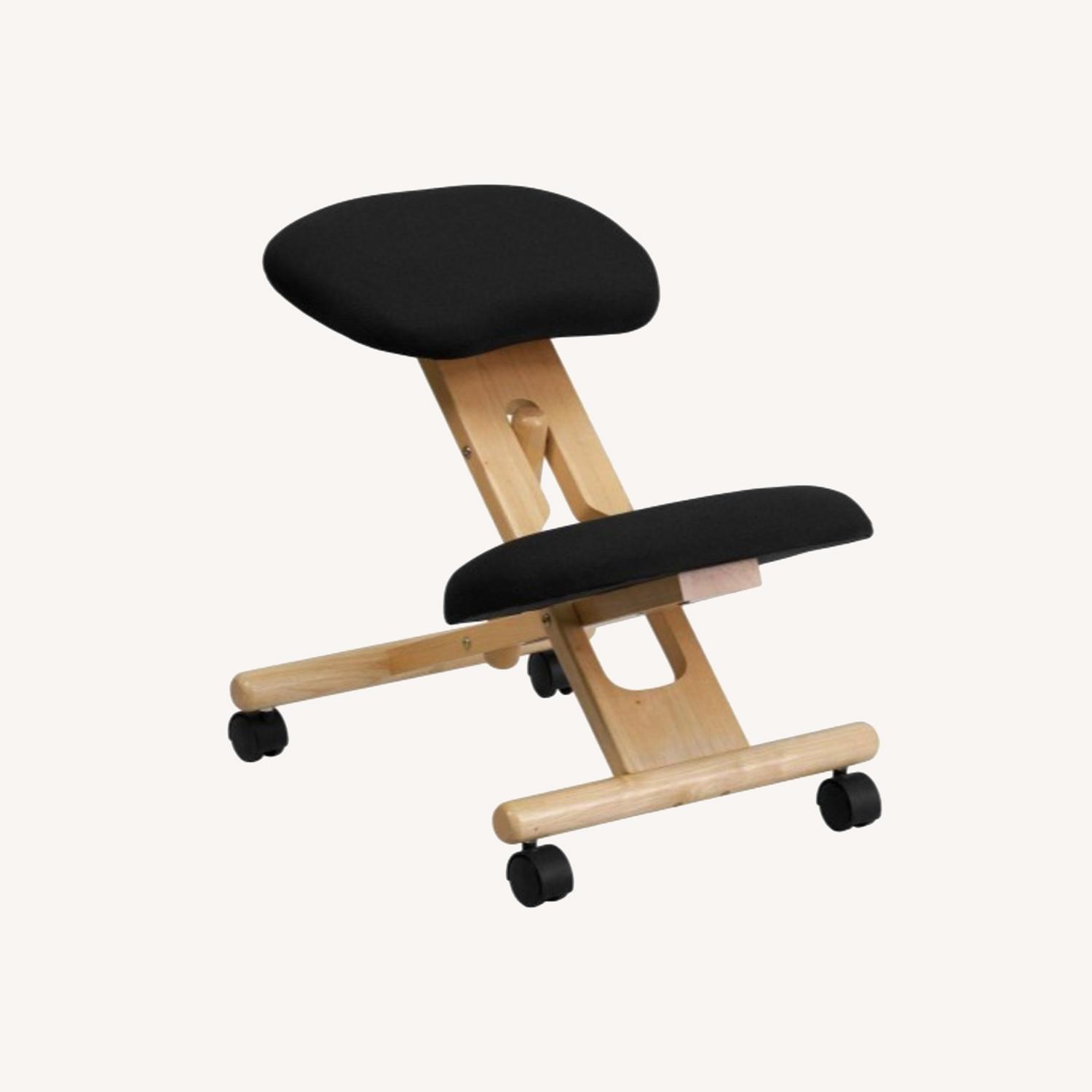 Seller's Notes:Wooden kneeling chair on wheels with black fabric cushion knee pad and seat. Adjustable seat height. Minor wear along knee pad seam. Great to keep your posture while working at a desk.
