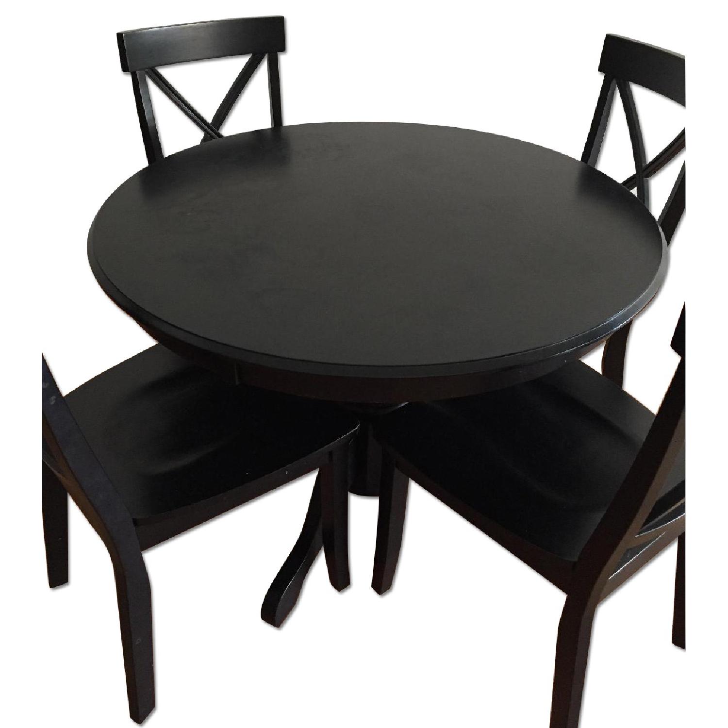 Seller's Notes:Selling a beautiful 5-piece black dining table set for $400, cash only please. Must be able to pick up in Tribeca. Crafted specially for casual family sit-downs, this 5-Piece Dining Set from Home Styles easily merges well with any home decor. The wooden frame ensures great sturdiness and durability. This set includes a round table and four complementing chairs, all in black. You can sit comfortably thanks to the cross back rest of the chairs. Maximum support and stability is offered by the pedestal styled base of this 5-piece dining set. It can be cleaned with a damp cloth. Specifications: Weights & Dimensions Table Overall Table Weight: 74lbs Side Chair Side Chair Seat Height: 18" Overall Side Chair Weight: 24lbs Table: 30" H x 42" W x 42" L Side Chair: 38.75" H x 19" W x 22.5" D Seat: 18.8 W x 22.25 D Weight capacity: 250 lbs (chair) Features Sturdy pedestal style footed base table Stylish cross back chairs Finish: Oak Color: Brown Made of Asian hardwood/rubberwood Product Details Top Material: Wood Base Material: Other Chair Material: Wood
