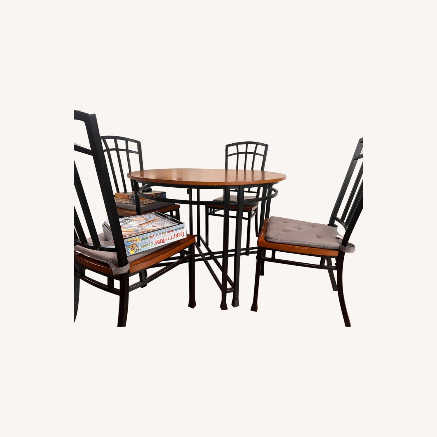 Seller's Notes:Hi, This is a 5 piece dinner table (4 chairs and 1 round table). I am including a table cloth, two types colors of tables leaves (4 leaves in all) and IKEA cushions for each chair. I am charging only for the table and chairs, everything else is included.