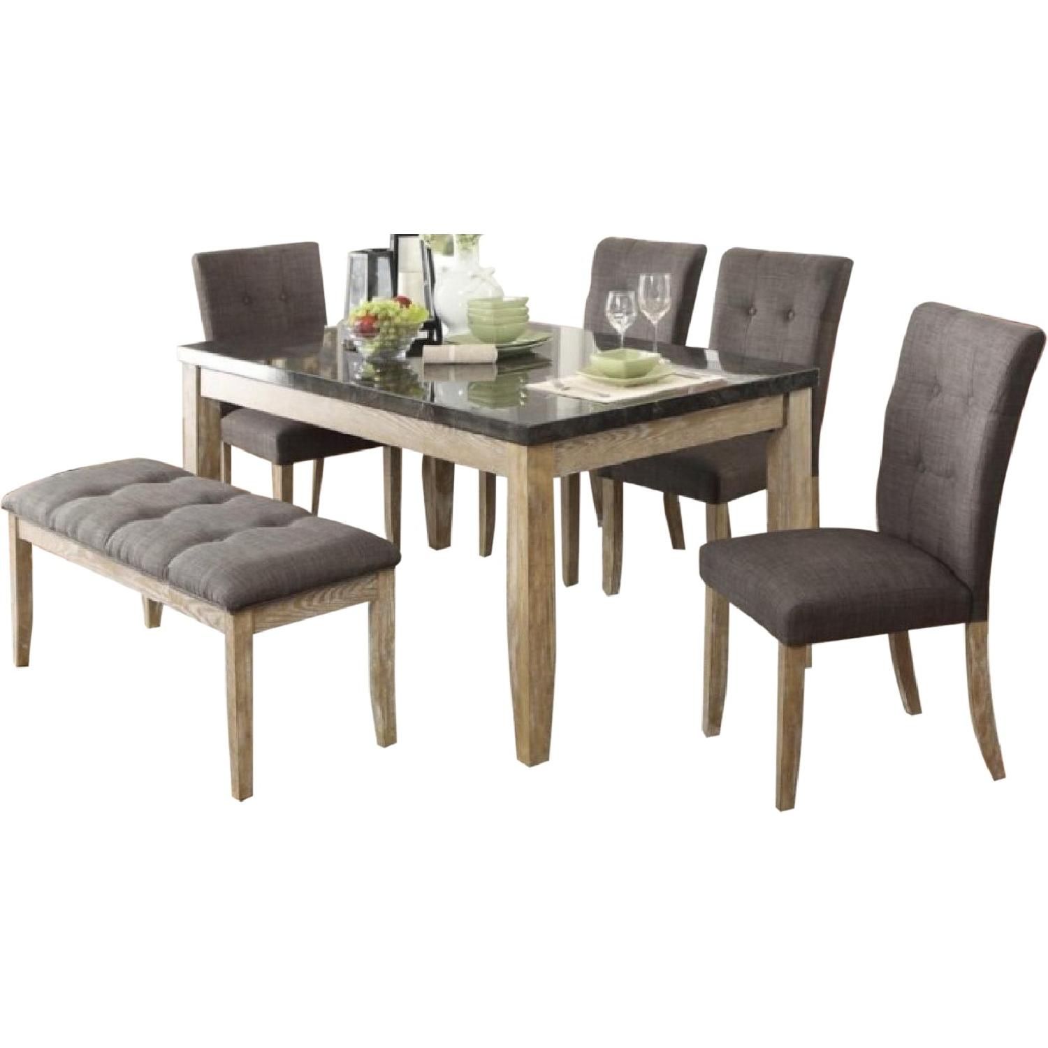 Seller's Notes:The table top is a faux bluestone marble that pairs with gorgeous weathered wood finished legs to create a crisp modern silhouette. Each of the chairs in this set feature the same weathered wood finished legs but showcase an upholstered seat and seatback. The seatback, as well as the upholstered seat of the bench, feature elegant button tufting to create a unique look perfect for your dining space.