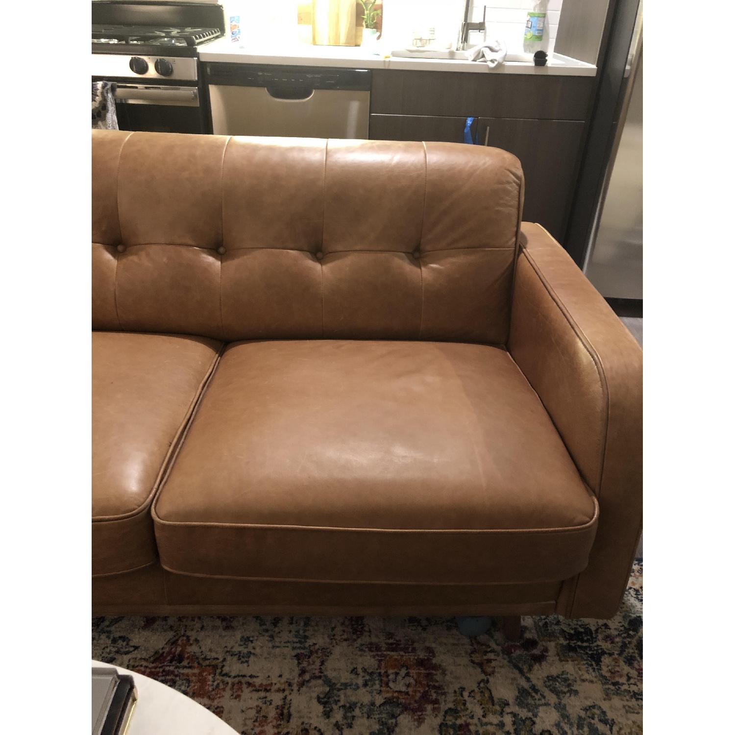 Seller's Notes:Two Seater Leather Sofa - Minor scratches prior to purchasing - Mid-century legs - Easy to clean - 1 year old
