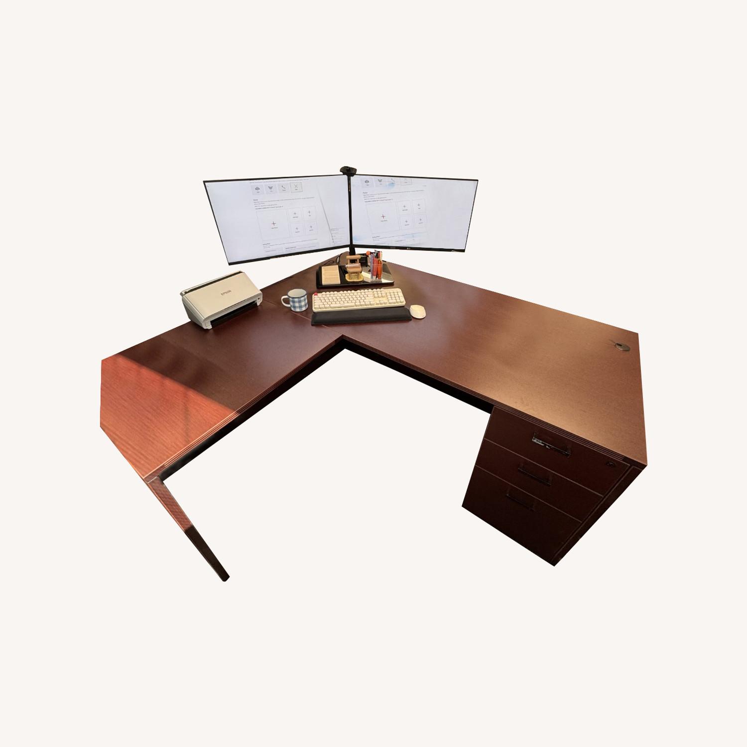 Seller's Notes:These sturdy, well furnished desks have been a part of the office family for around 5 years. It doesn't collect a lot of dust, is easy to clean, and has a very professional color layout. Each set is adjustable for right hand and left hand users due to the two-piece set up. Highly recommend for those are looking for a long-term sturdy desk set up. Also includes lots of leg space with ample room with a desktop, trash bin, and personal items such as work slipper and mini heaters! Includes wire pockets to hook below the table for a sleek design.