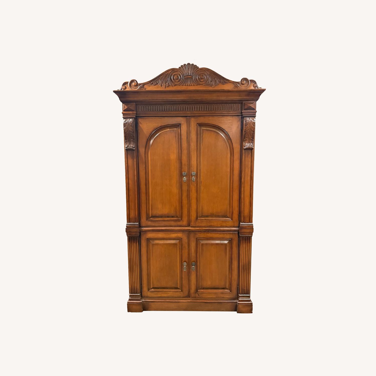 Seller's Notes:Beautiful solid wood armoire in excellent condition. High-quality construction with detailed carved accents. Very sturdy and offers a ton of storage. The upper cabinet has a deep interior with an adjustable shelf and a rear cutout for cords, making it great for a TV, coffee bar, wardrobe space, or general storage. The lower cabinet includes multiple shelves for added organization. Dimensions: • Height (front): 90 in • Height (sides): 81 in • Width: 46 in • Depth: 25 in Comes from a clean, smoke-free home. Pickup only. This piece is very heavy, so please bring help to move it.