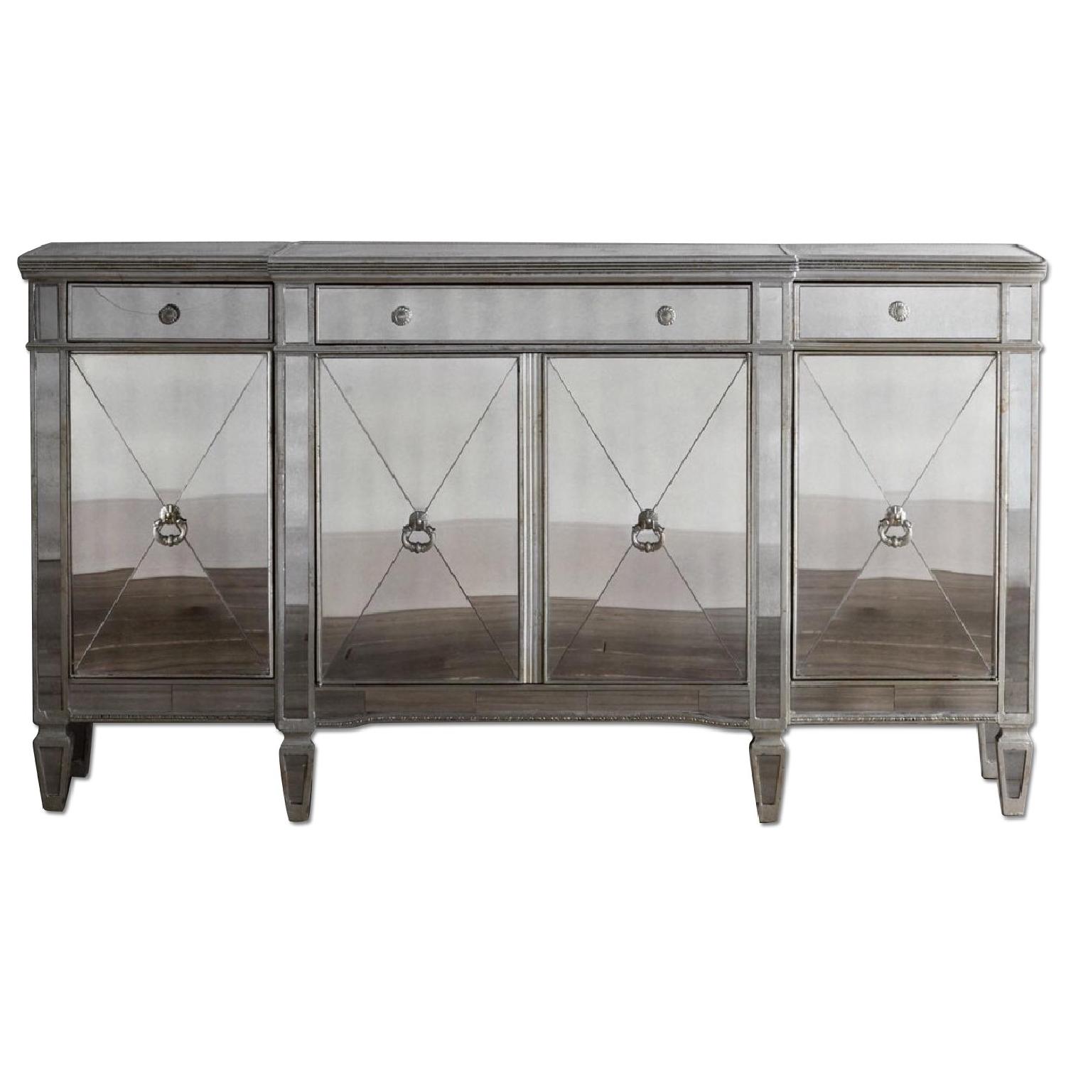 Seller's Notes:Selling due to moving! Otherwise would be keeping this piece! Well made, reflective mirrored console with multiple storage options. (Two shelves in each cabinet). The shelfs are removable and adjustable to different heights. Made of hardwoods and mirrored veneers. Painted silver finish with golden antiqued-glaze highlights. In great condition $3,664.00 Suggested retail price 70"W x 20"D x 38"T
