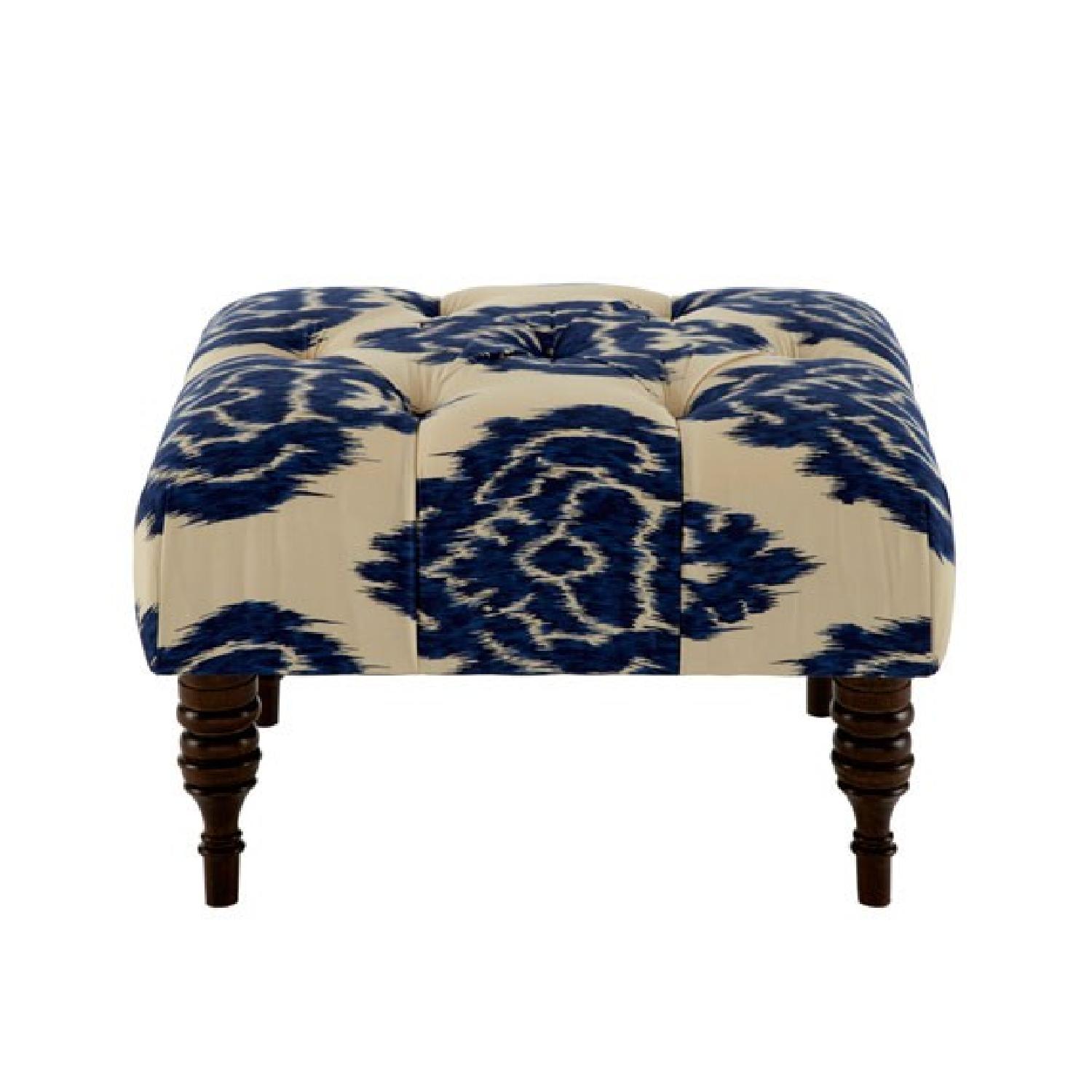 Seller's Notes:Beautiful cotton tufted ottoman in blue/white ikat print with solid dark pine legs. Legs screw off for assembly. Selling because I am recently moved, and no longer need this piece.