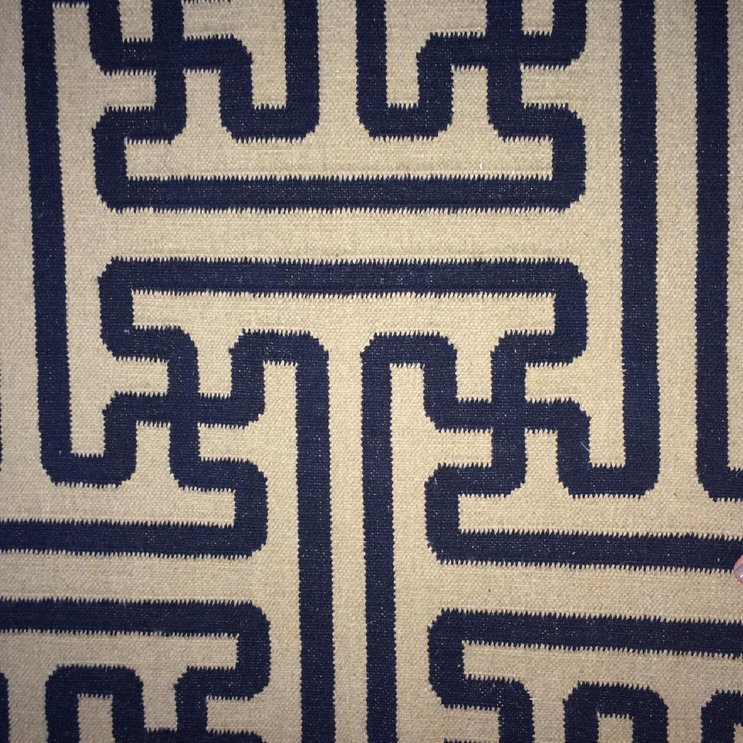 Seller's Notes:A tile from the archives of the Smithsonian inspired the design of this handwoven 100% wool flatweave rug. Imported. Minor signs of use on this rug. In great condition! Color of stripe is navy. http://www.horchow.com/Grecian-Tiles-Rug/cprod70100008/p.prod