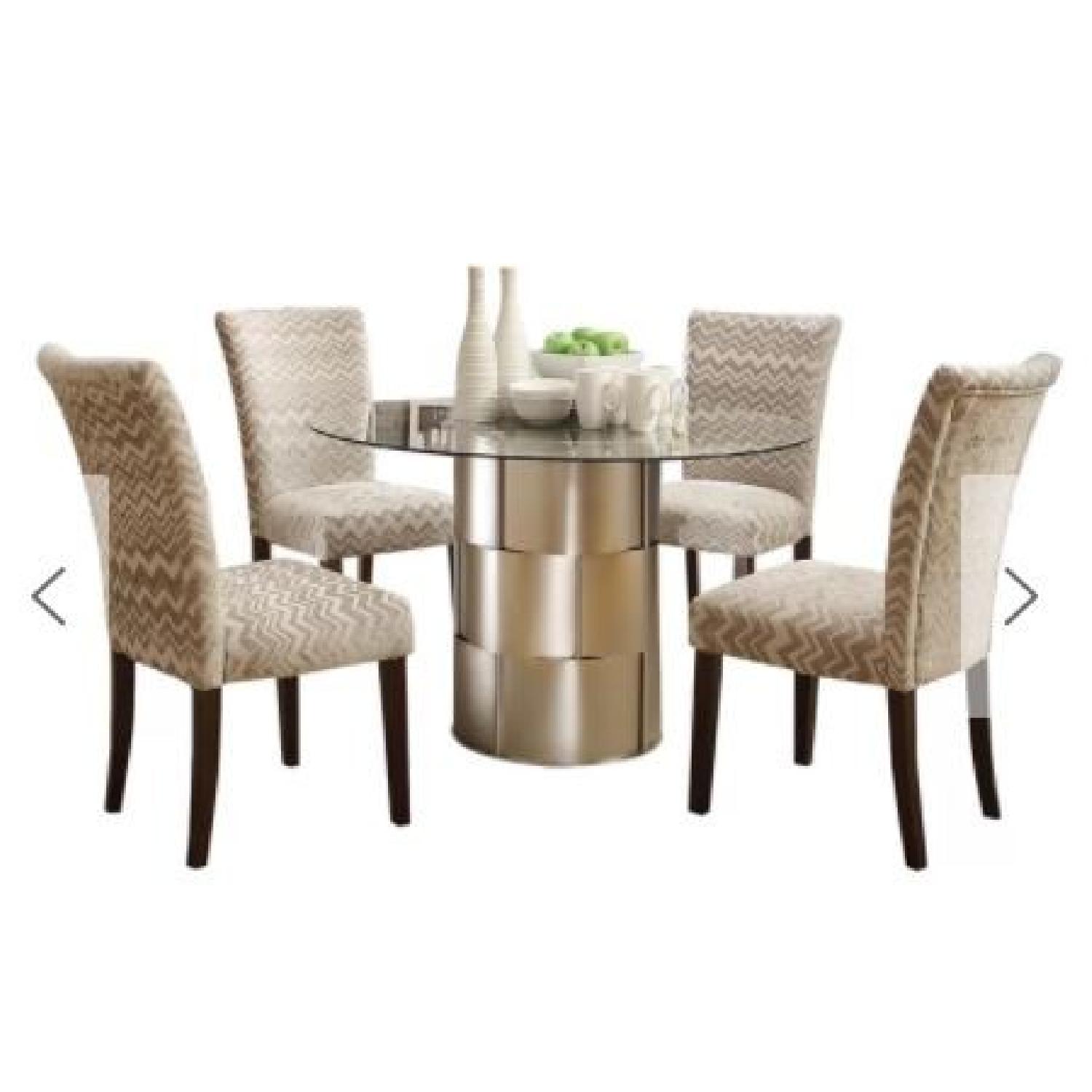 Seller's Notes:Moving and NEED to sell ASAP! Bought this table less than a year ago, barely used it. Like brand new! Super cute/ in love with it, but cannot take to my new apartment. Details are; Table material: Chrome, tempered glass Chair material: Rubberwood, fabric Chairs upholstery fill: Foam Cliburn collection Pieces Included: 1 Dining table and 4 Chairs Table Base Material: Metal Table Top Color: Clear Table Base Color: Chrome Table Mechanism: Fixed Table Seating Color: Espresso Seating Capacity: 4 Weight Capacity: 300 Table Top Material Table Top Material: Glass Top Material Details: Tempered glass