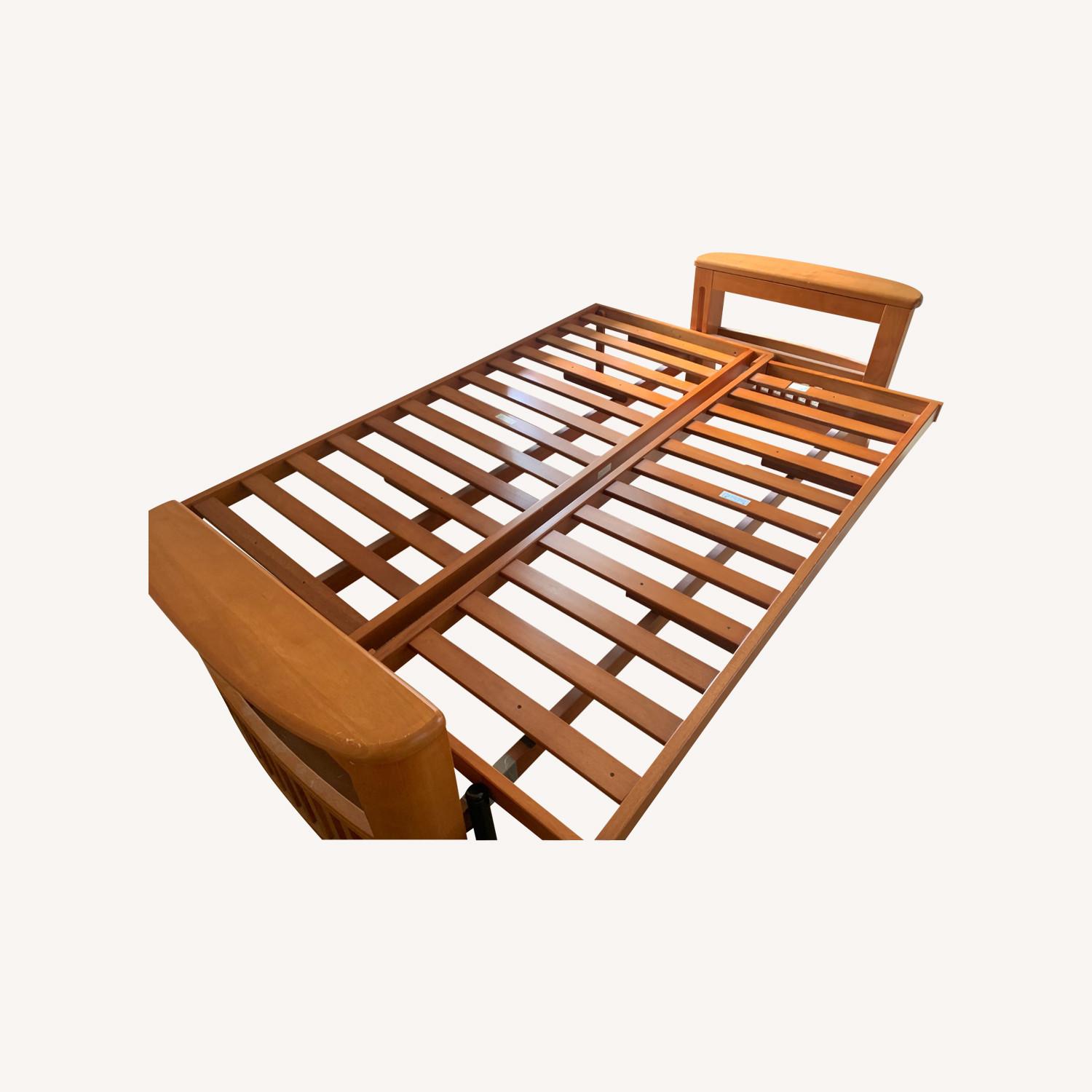 Seller's Notes:Full size wooden bed frame in good condition, available to pick up from 2/2/24. Bed frame has 2 small storage units on the head and foot headers.