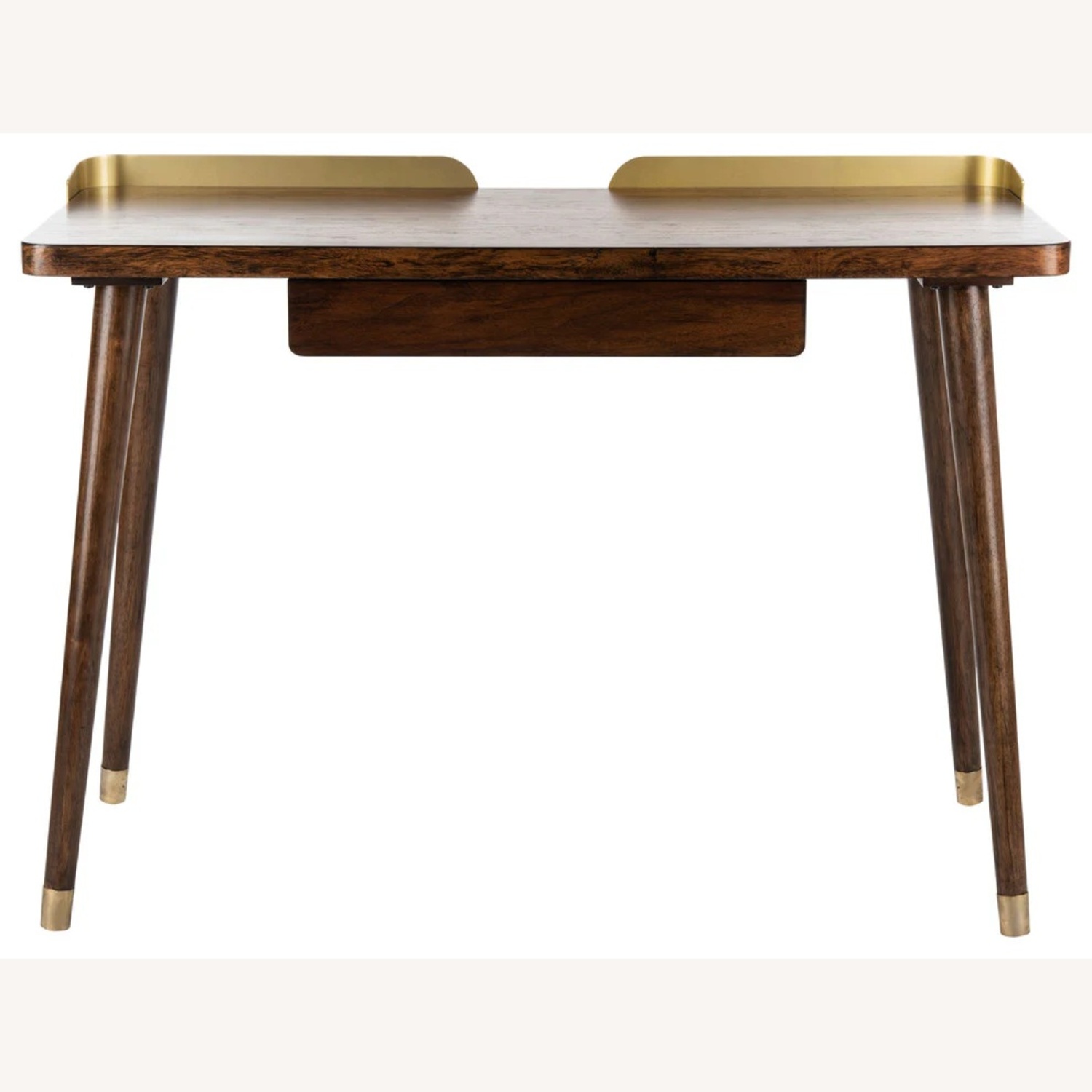 The focal point of any home office, this 1-drawer desk is a contemporary spin on retro style. Designed with a dark walnut finish, its deep palette is paired with vintage-style legs with gold finished caps. Its discreet drawer keeps clutter safely stored.Drawer Dimension: 22" x 14.7" x 3"