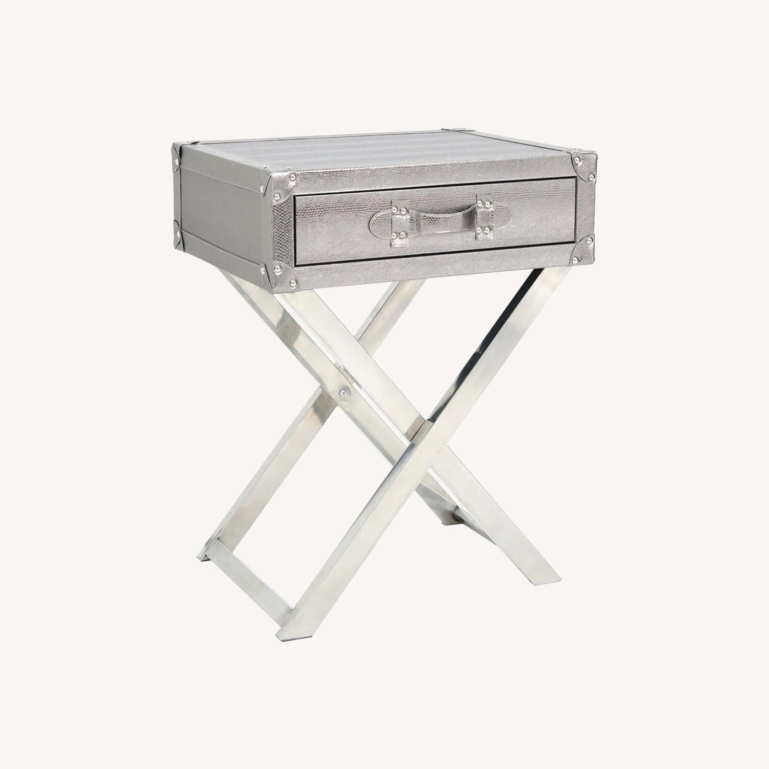 Seller's Notes:These two silver faux lizard skin nightstands are two years old and are in like new condition. They are made of leather and have stainless steel legs. The drawers are lined with velvet.