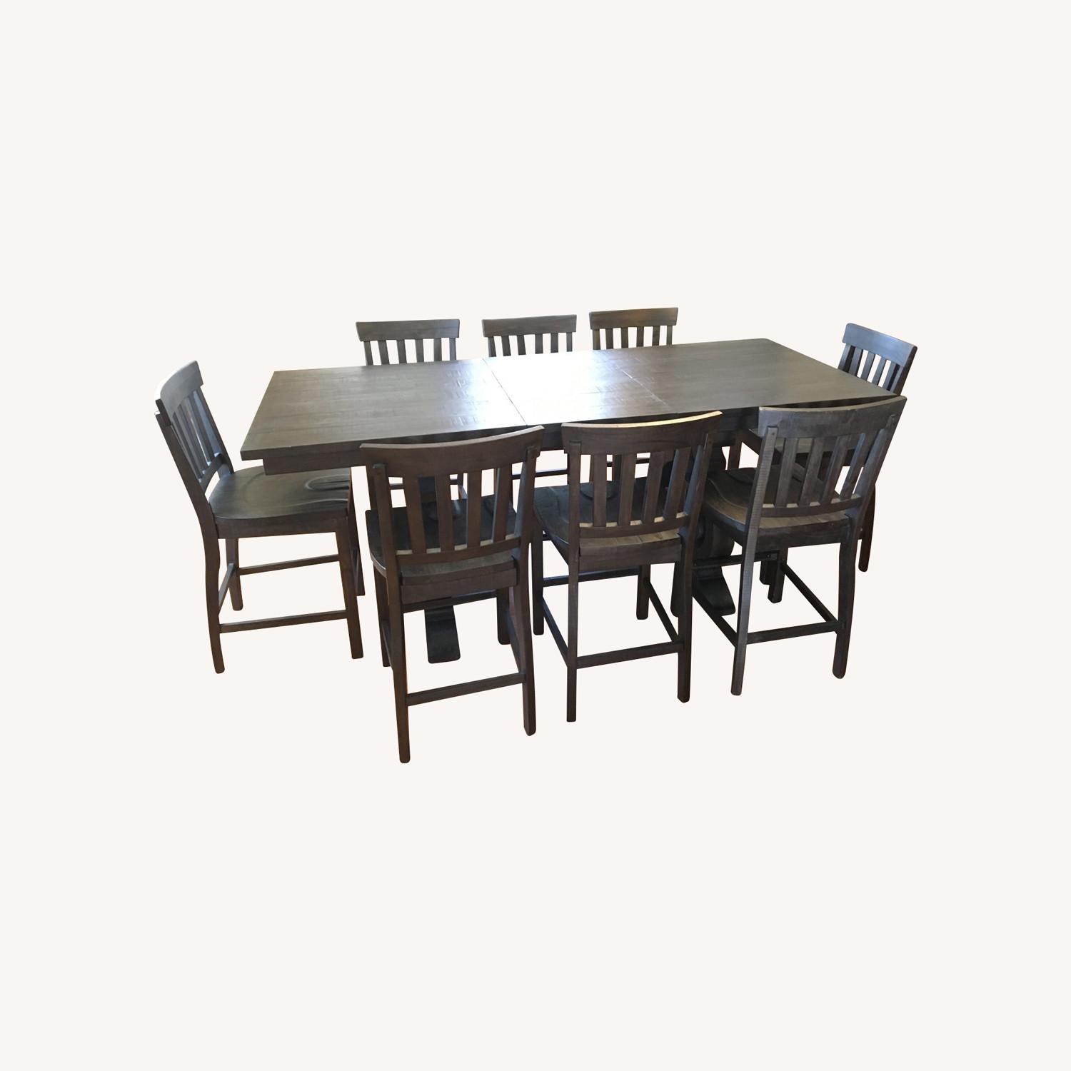 Seller's Notes:This rustic-style dining set is just 1 year old and in perfect condition. We purchased this set just prior to moving this past January 2020. The set doesn't fit in our new home and we regrettably have to sell it. SMOKE FREE/PET FREE ABOUT THE DINING SET: Gustavian influenced Harper Dining Room creates charming ambiance in a matte black with pewter highlight finish. Set the perfect place setting at this counter height dining table. Large rectangular table features double pedestal carved scroll base with a retractable, hidden 20" wide BUTTERFLY LEAF and a handsome weathered bronze metal stretcher. The Butterfly Leaf is very convenient as it folds neatly into the table for storage when you don't need the extra length. This gorgeous counter height table is perfect for prepwork and entertaining. Table comes with eight (8) slatback counter height chairs which feature metal covered footrests. Perfect for the farmhouse look with a bit of flair. 9PC PKG INCLUDES: Expandable Counter Height Dining Table and 8 Counter Stools MEASUREMENTS: EXPANDABLE TABLE 36"W x 66"L (retracted)/86"L (expanded) x 36"H CHAIRS 19"W x 20"D x 40"H (seat height 24") This package CURRENTLY sells at Huffman Koos for $2,994 (this price includes the 7 piece set plus 2 extra counter chairs). You will wait at least 4-5 months or more for delivery for a brand new set but you can own this practically brand new set right away.