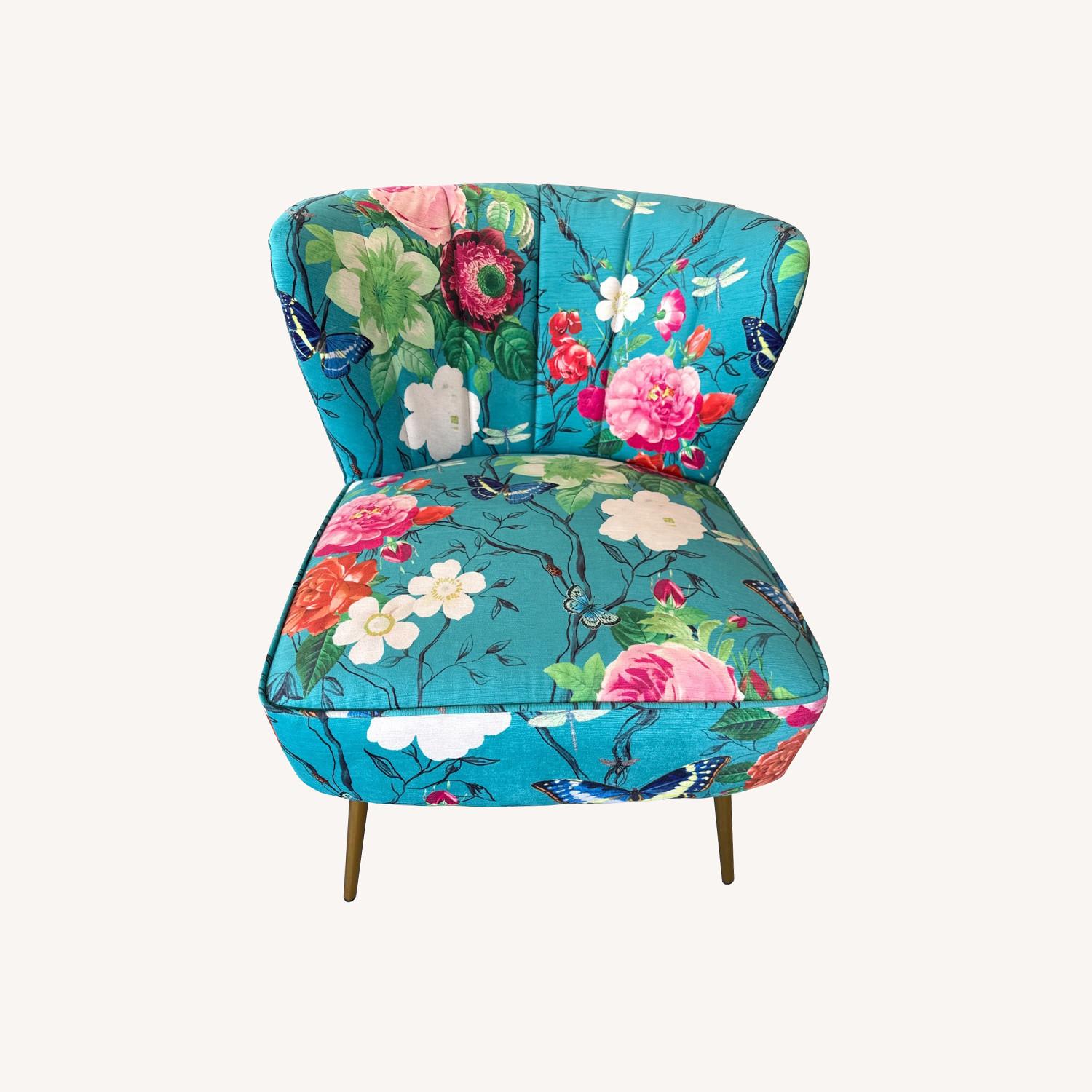 Seller's Notes:This is a beautiful blue/teal floral print accent chair. The print is so bold and vibrant. This chair would make a perfect addition an office, bedroom or living space. This is a new chair with tag and no defects. It was bought to sell in my retail store.