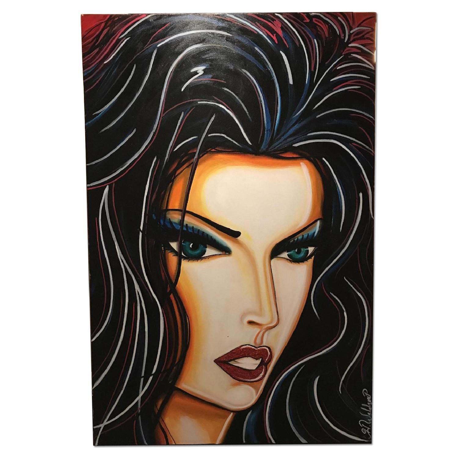 Seller's Notes:Original painting by Hulbert Waldroup. Oil on canvas. Hulbert Waldroup is a "painter to the stars" with works of art in the homes of Whoopie Goldberg, Quentin Tarantino, and other A-list celebrities. I found this piece at an art show in lower Manhattan, a few years back and immediately fell in love with it. It was a great statement piece for my large bedroom wall, and as you can imagine generated a lot of conversation. The colors are fantastic and the red glitter lips really pop in the painting adding an additional level of sophistication. It is a perfect peace for any modern Manhattan apartment pushing for a trendy, pop look. My decorator and I are updating the apartment to a more "modern farmhouse "look, and unfortunately this stunning piece no longer will fit into the new decor plan.