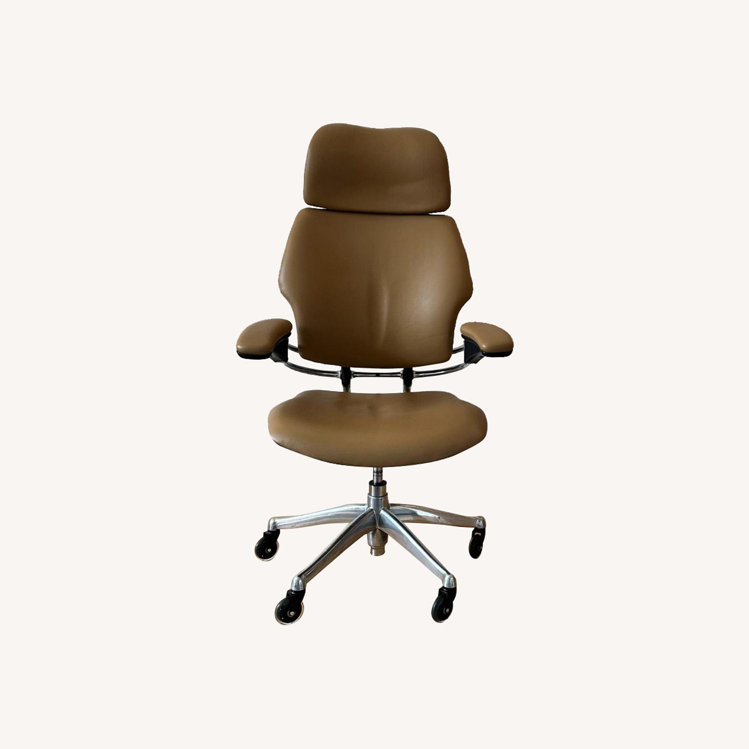 Seller's Notes:Humanscale Freedom Chair. Bought refurbished from Seating Mind in 2022. Chrome base, brown leather upholstery, soft rollerblade casters.