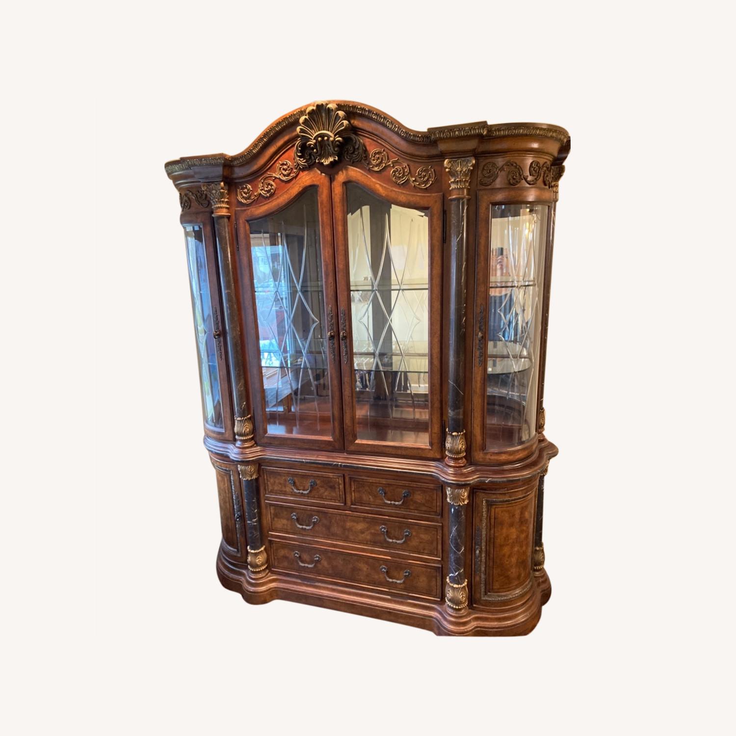 Seller's Notes:Solid wood cabinet with marble accents and glass shelving. Built in lighting that is turned on by touch of hinge. Beautiful piece in great condition. The time is stacked with 2 individual pieces.