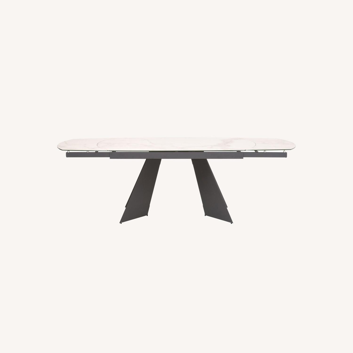 Seller's Notes:"Enjoy nightly meals and hosting dinner parties around this contemporary extension dining table. The smooth white ceramic table top easily turns to expand and contract the built-in leaves at each side of the table. While the base creates a striking contrast to the top, as it is made of a matte dark gray metal with a very modern design. The table measures 63"" and 94.5"" when extended. - Clean, Modern Design With Great Function - Two Self-Storing Extension Leaves - Extension Mechanism Activated By Spinning The Top - Metal Base"