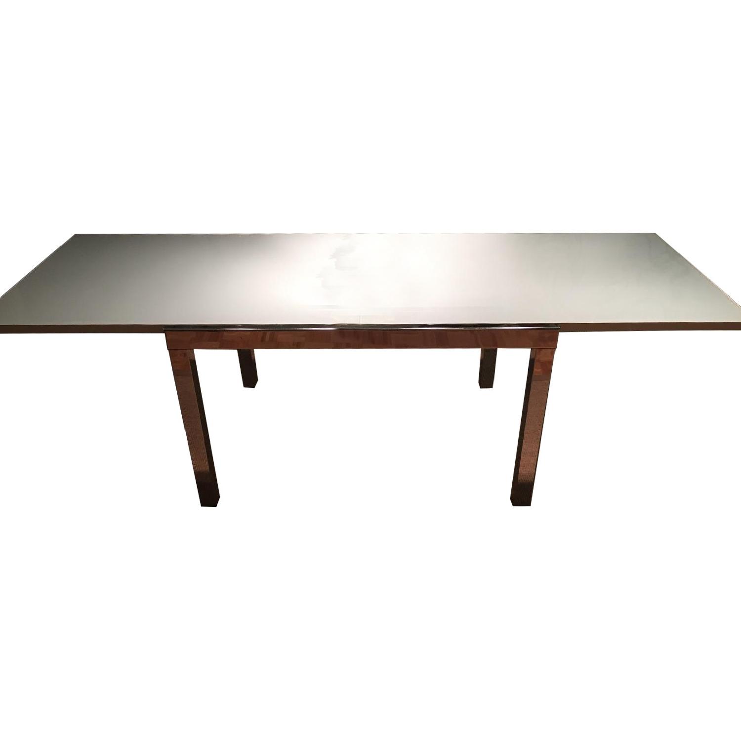 Seller's Notes:Modern Italian design frosted white glass and chrome metal dinning table. Can accommodate 4-6 comfortably. Closed dimensions are : 48.5" L x 36.25" W x 29.5" H Extended: 97" L X 36.25"W (at widest metal part and 34"W at white framed glass section) x 29.5 "H Brand website: http://www.idealsedia.it/en/milano-2/