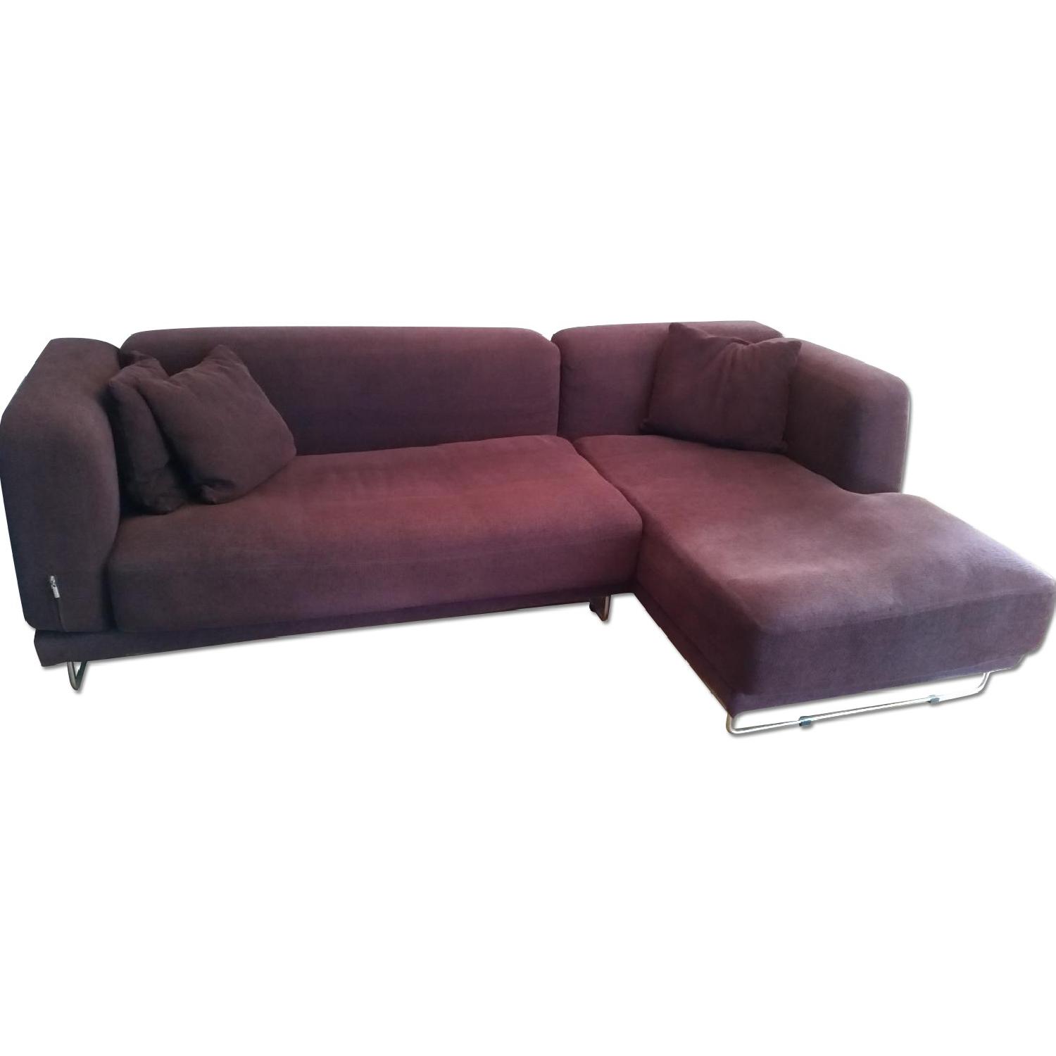 Seller's Notes:Two piece modular sofa sold as a set. Can be used as separate pieces or attached together as seen in pictures: one left arm chaise: 36 W x 30 H x 60 D one arm seat (can be set as left or right arm): 62 W x 30 H x 35 D Deep rich eggplant color with cloth material 3 throw pillows included (minor stitching undone on one pillow) Comfortable for napping/sleeping Easy to move and self-assembly No issue moving into apartments or through narrow spaces
