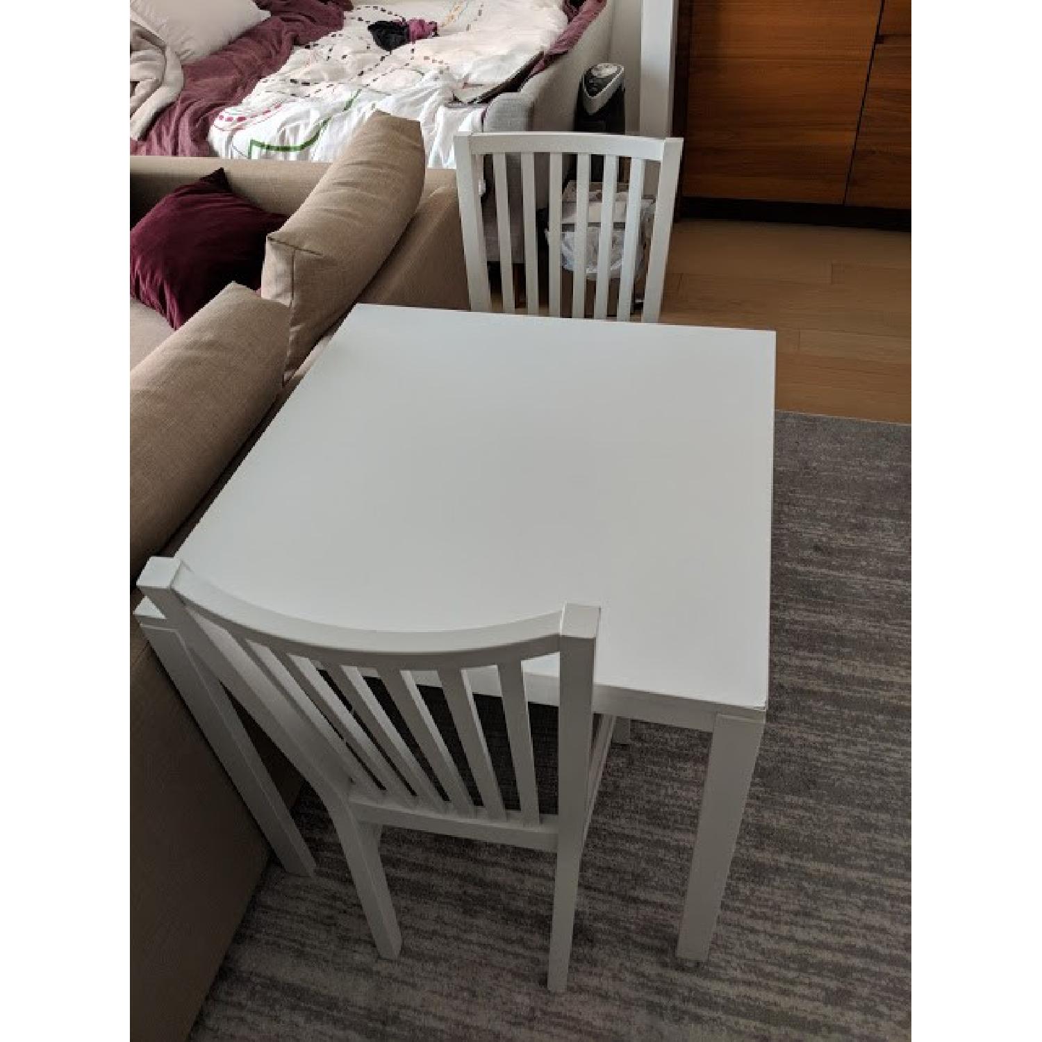 Seller's Notes:Great little dining set for apartment living! Chairs are in mint condition, table has a couple nicks on the tabletop surface. The basis for any good conversation is a comfortable chair to sit in with a high, curved back and padded seat. NORRNÄS chair offers all this and a straightforward design that is typically Scandinavian. Chair: Tested for: 243 lb Width: 16 1/2 " Depth: 20 7/8 " Height: 37 3/8 " Seat width: 16 1/2 " Seat depth: 15 3/4 " Seat height: 18 1/8 " Table: Length: 29 1/2 " Width: 29 1/2 " Height: 29 1/8 "