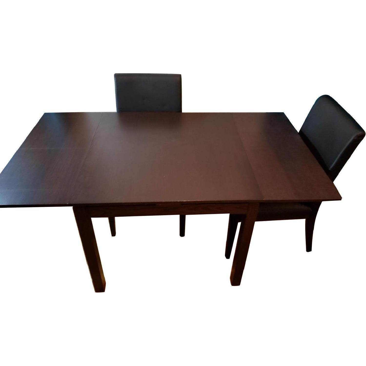 Seller's Notes:This sleek IKEA wood and leather dining room set is perfect for apartments and dining rooms. The chairs are genuine leather (18" wide, 24" deep and 38" high) and sit comfortably-- and double as living room side chairs. The 35.5" square, 29.5" high table extends to seat 6 with two 15.5" leafs.