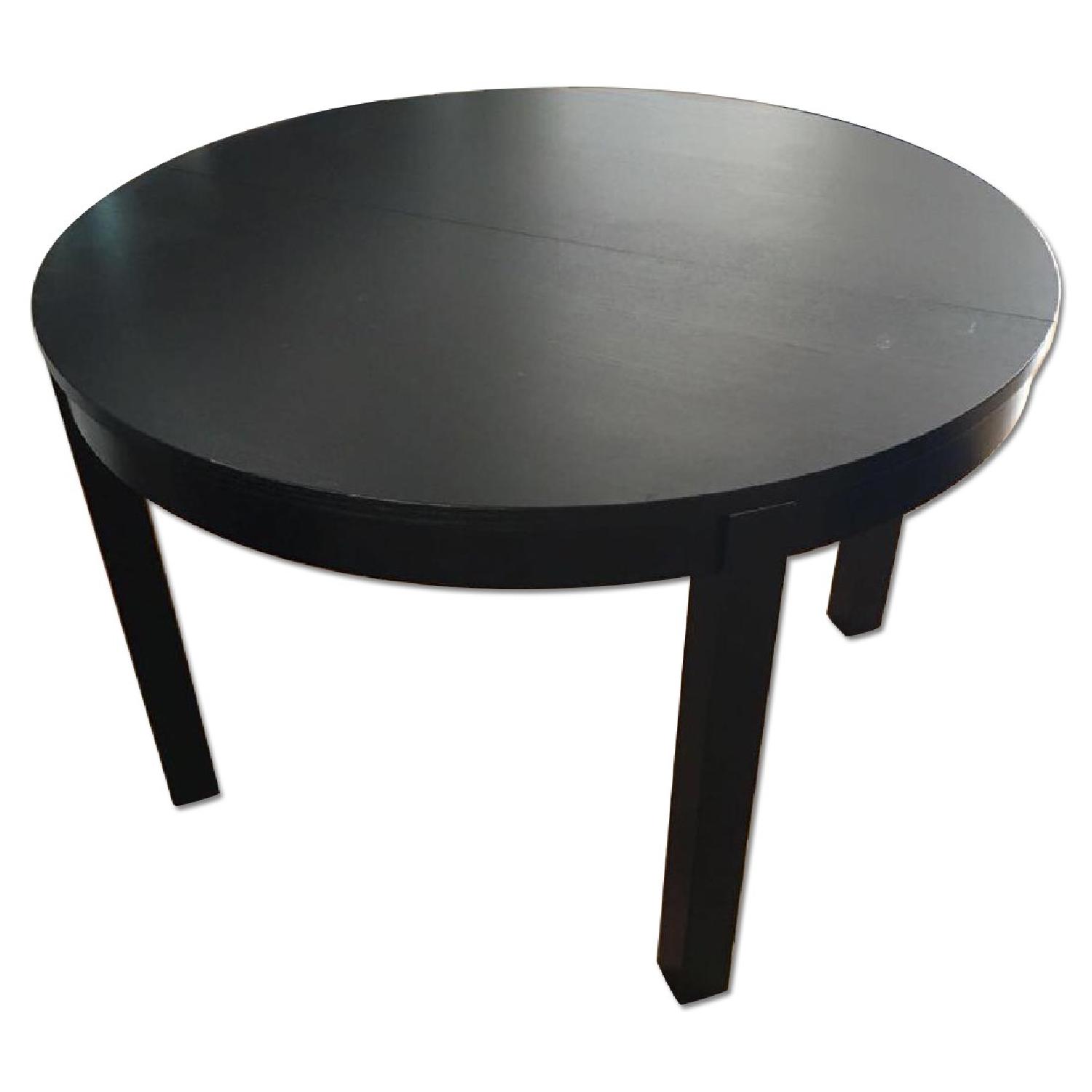 Seller's Notes:• IKEA BJURSTA Dining Table set • Set includes one table and six chairs • Fiberboard, Metal • Brown-Black lacquer finish • Fully extended dimensions (seats 6): 65''L x 45''W x 29''H • Smaller dimensions (seats 4): 45"L x 45"W x 29"H • Original price $230. Selling because I'm moving abroad. I bought this entire set brand new directly from IKEA. Sleek design makes it a beautiful addition to any living/dining area. Besides its contemporary design, the extra leaf (inner extension) adds 20" to its length. The extra leaf stays hidden under the table's surface and is easy to uncover. Table's size adjusts to seat 4 to 6 people. Comes with 6 dining chairs of the same style. Some scratches (see images). Overall great condition!