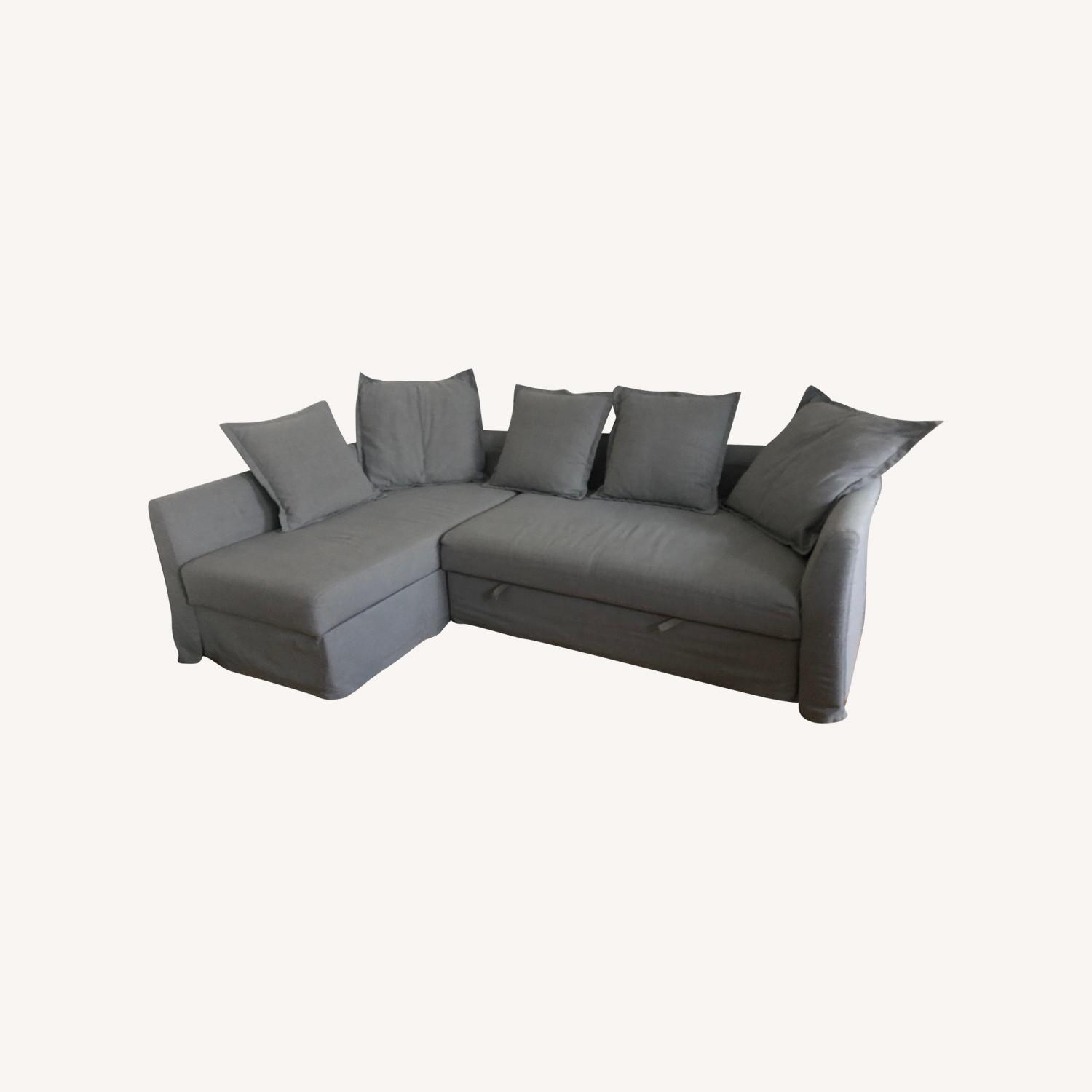 Seller's Notes:We bought this sofa 7 years ago. We have taken good care of it. Friends and family have stayed on the sofa bed. We had a cat for a year that would hang out with us on the sofa, but that was 5 years ago. Some of the fabric has a slight fuzz because she scratch the arm and the part that becomes a bed. But they are not very noticable. We wash the covers every 6-month and we would hand them off cleaned to the buyer. The sofa has a nice storage space and it can turn into a bed!