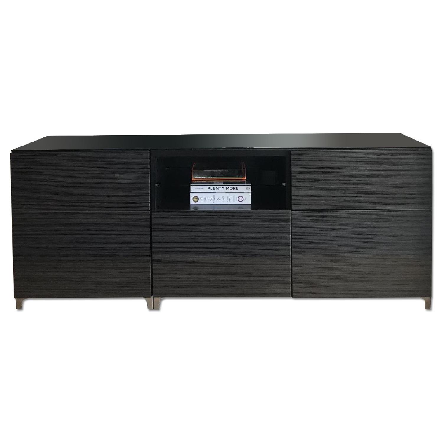 Seller's Notes:Ikea Besta storage combination with 3 doors, 2 drawers, and one glass shelf in Selsviken patterned high gloss brown. Push open doors and drawers. Top panel in black glass. I bought this console less than a year ago. I am moving and do not have space for it in my new place. It has tons of storage and is in great condition. Most people can't believe it's from Ikea.
