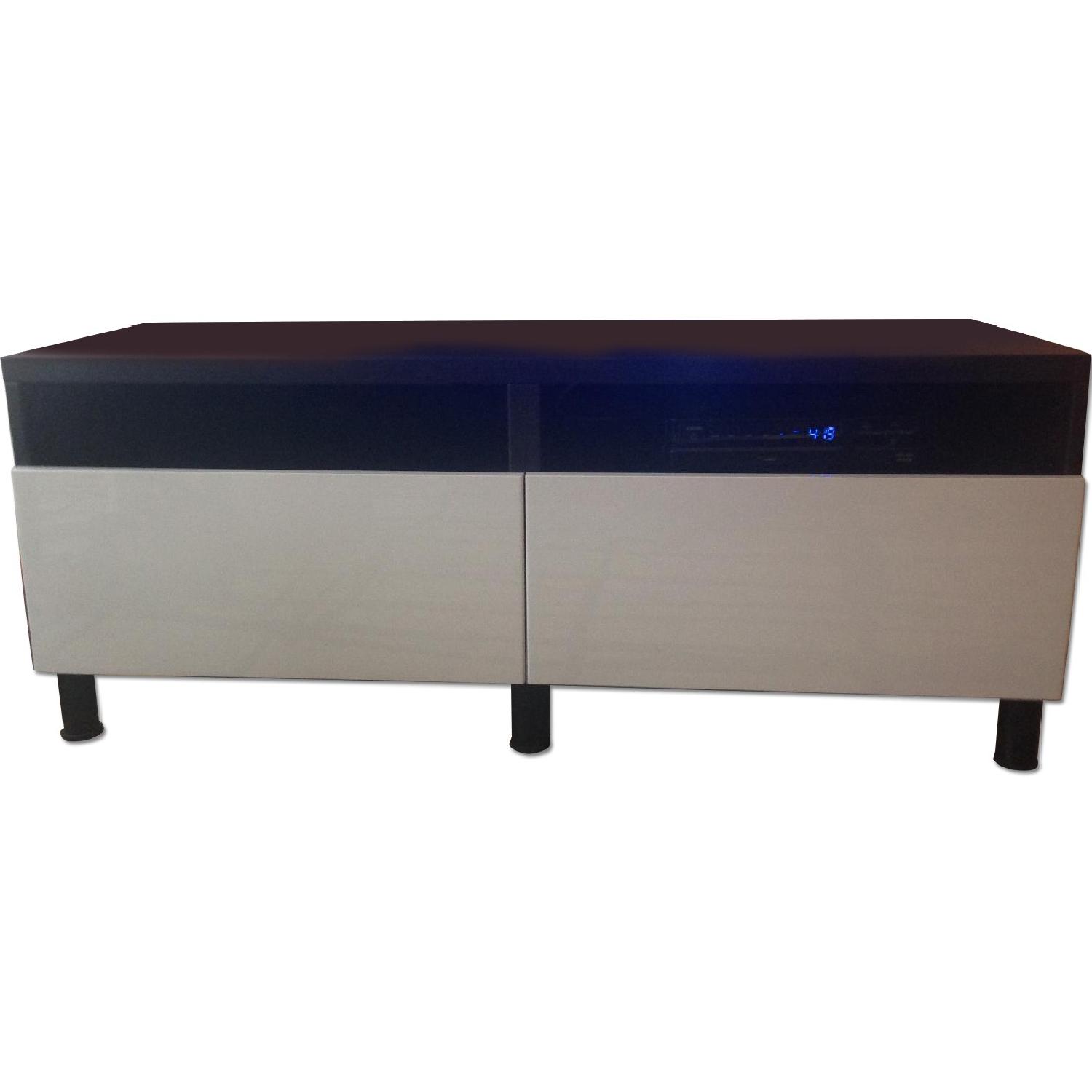 Seller's Notes:Ikea BESTA TV bench with two drawers in excellent condition. Black-brown with high gloss white drawer covers, open console spaces with covered back (a small hole was carved on the rear to for cable wires), and cylinder legs. Originally paid $274. 47.25" L x 15.5" D x 19" H. Would easily fit in the back seat of a vehicle.