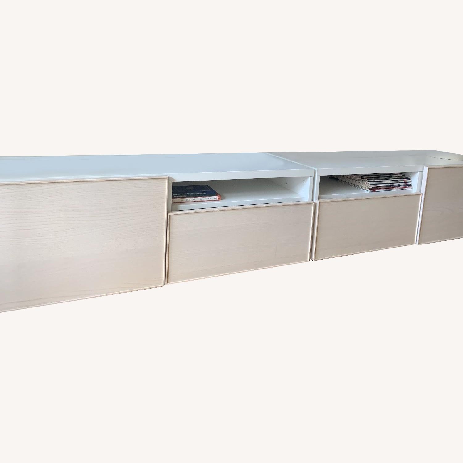 Seller's Notes:White and ash veneer. Sold as set (2 tables put together as in picture). Touch to open drawers. TV and other decor not included.