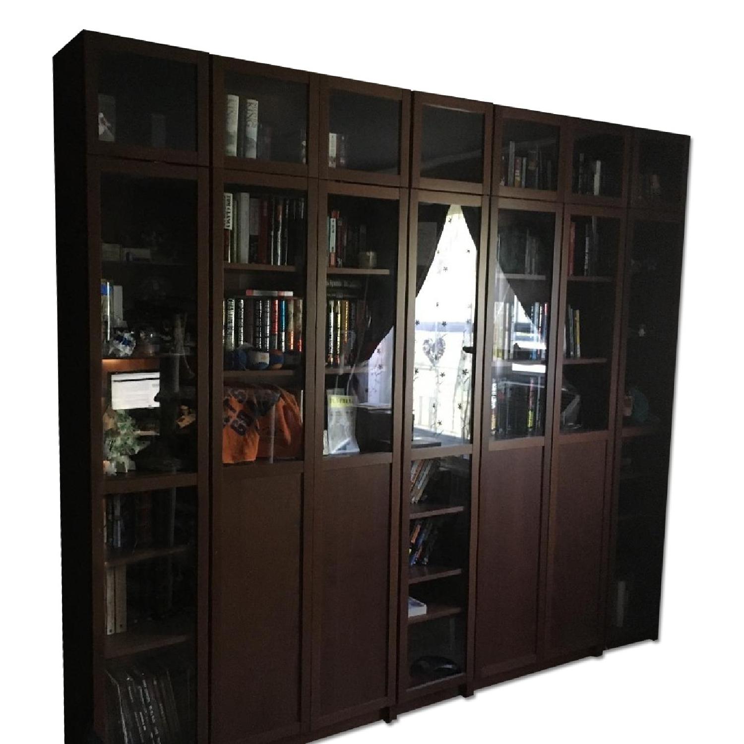 Seller's Notes:This set of billy bookcases includes: 2 31.5" wide cases 3 15.75" wide cases. Height extension units for all. Doors for all Glass shelves in the top sections of the 15.75" cases.