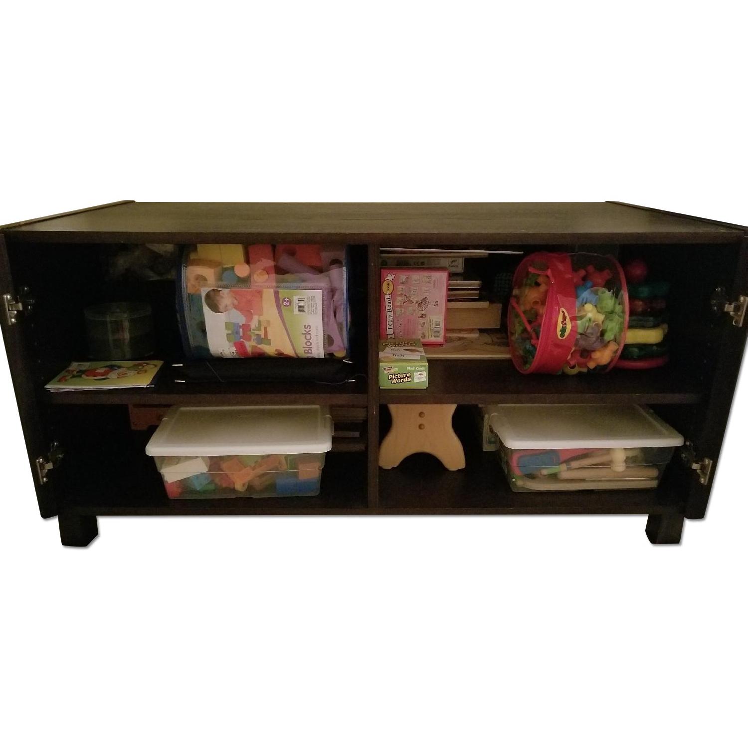 Seller's Notes:We are selling our Ikea TV stands. It has frosted glass doors, four shelves inside, color: dark espresso. Dimensions are 47 by 24. There are minor scuff marks (mostly from baby proofing).