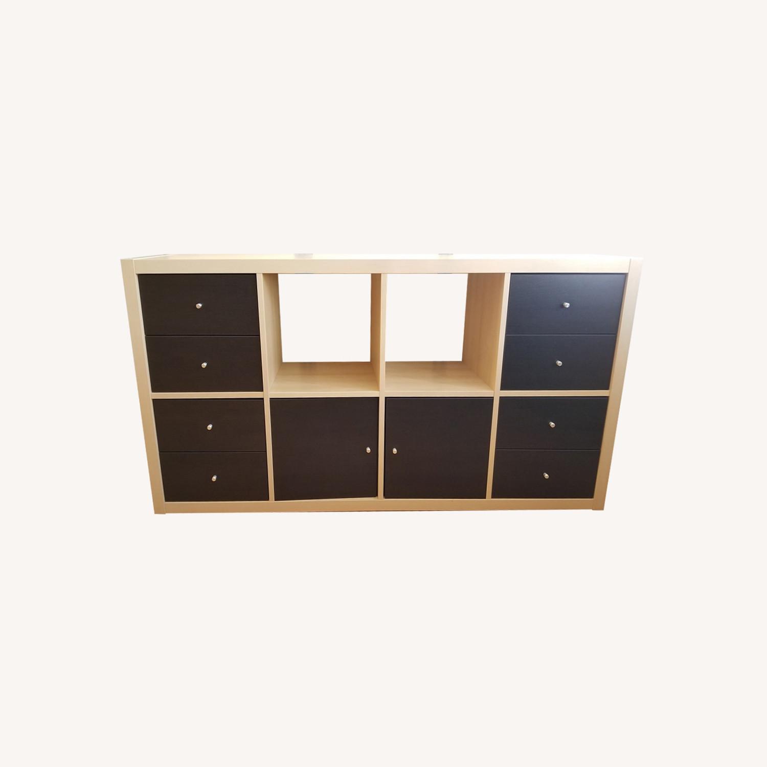 Seller's Notes:IKEA Kallax birch bookcase fully assembled with with 4 black/brown double drawer units and 2 cabinet door units. Four sliding feet on bottom to ease sliding into place without scratching floors. Great condition!