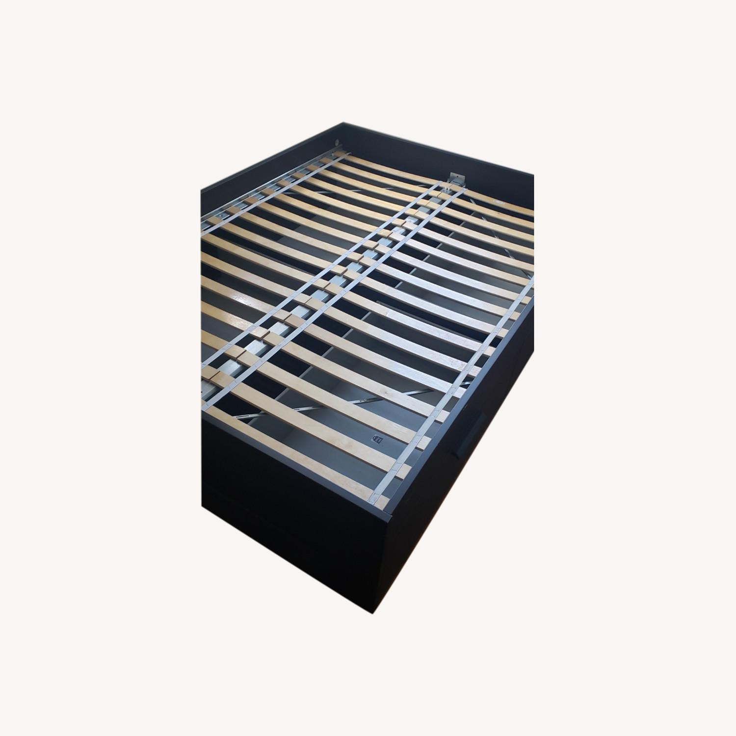 Seller's Notes:Black full sized storage bed from IKEA's Brimnes collection. Some minor cosmetic damage, scratches and scuff marks from when I first got it and lived in an apartment where it was up against exposed brick, but otherwise still in great condition. Bed has 2 drawers on either side, which can hold up to 20 kg/40 lbs, I've found they're great for storing extra bedding and the like. The drawers are 21" deep and pull out another 16 1/8" from the frame.