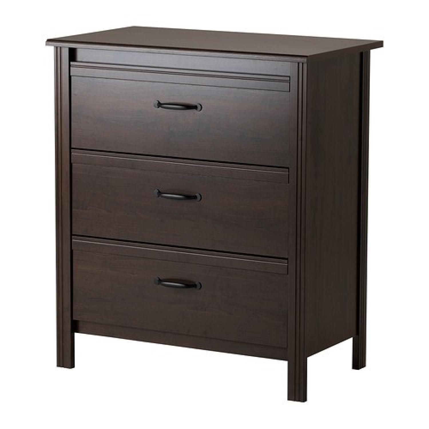 Seller's Notes:Ikea "Brusali" 3-drawer chest Color: Brown Smooth running drawers with pull-out stop. Product description Top panel: Particleboard, Foil, Foil, ABS plastic Side panel: Particleboard, Foil, Foil, Paper Leg: Fiberboard, Foil Rail: Particleboard, Foil Back: Particleboard, Foil, Foil Drawer front: Particleboard, Fiberboard, Foil, ABS plastic Drawer bottom: Fiberboard, Acrylic paint