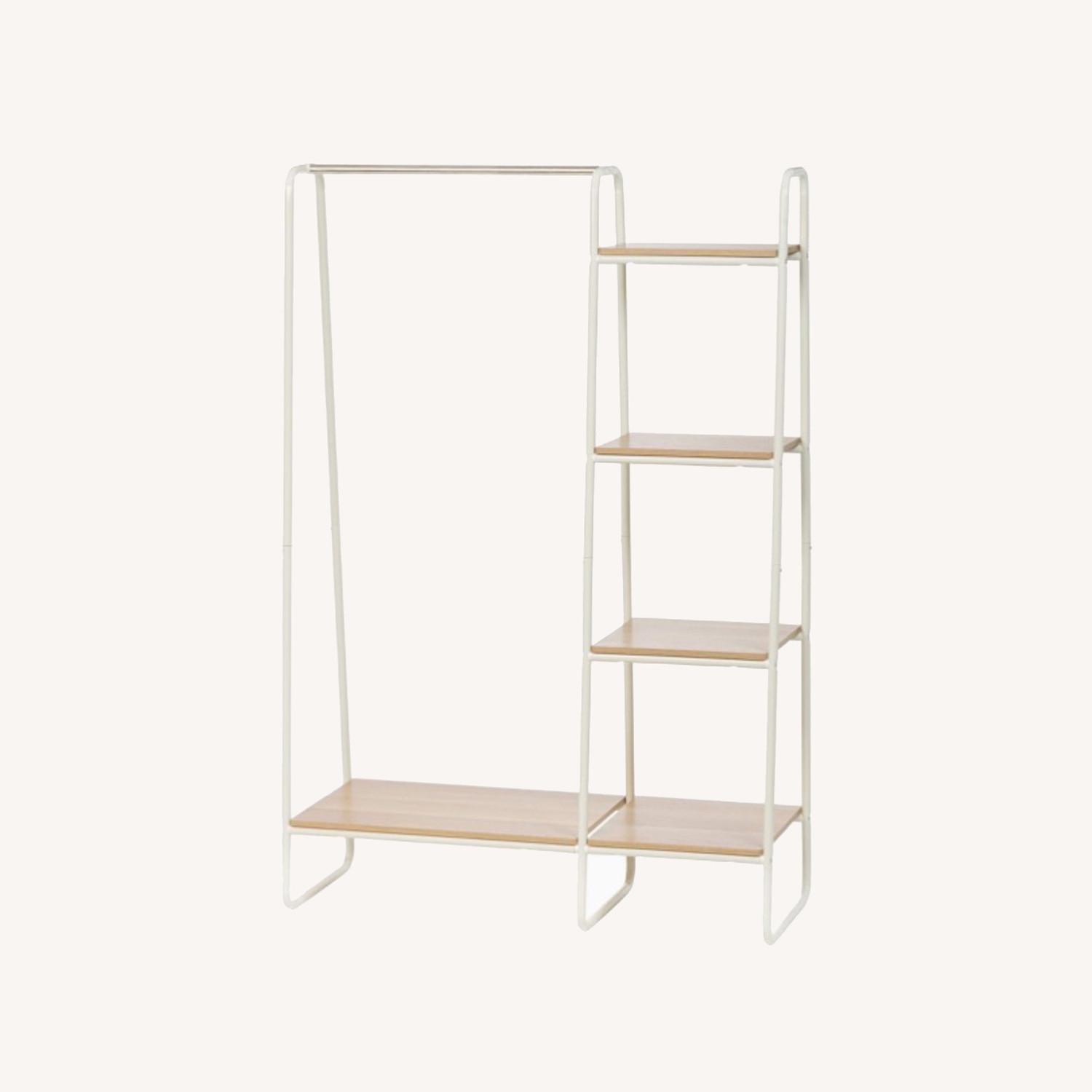 Seller's Notes:MOVING SALE: 15.75 x 39.8 x 59.45 inches This metal garment rack with wood shelf provides a convenient closet solution for small spaces. The built-in wood shelves at the Bottom and on the side great for storing shoes or folded clothes, while the two foot wide closet rack gives you plenty of space to hang your clothes. Side shelves are also great for home décor or storage when shelf is out in the open. Available in white frame with light brown wood or black frame with dark brown wood, you can mix and match the garment Racks to create customizable closet organization to suit your needs.
