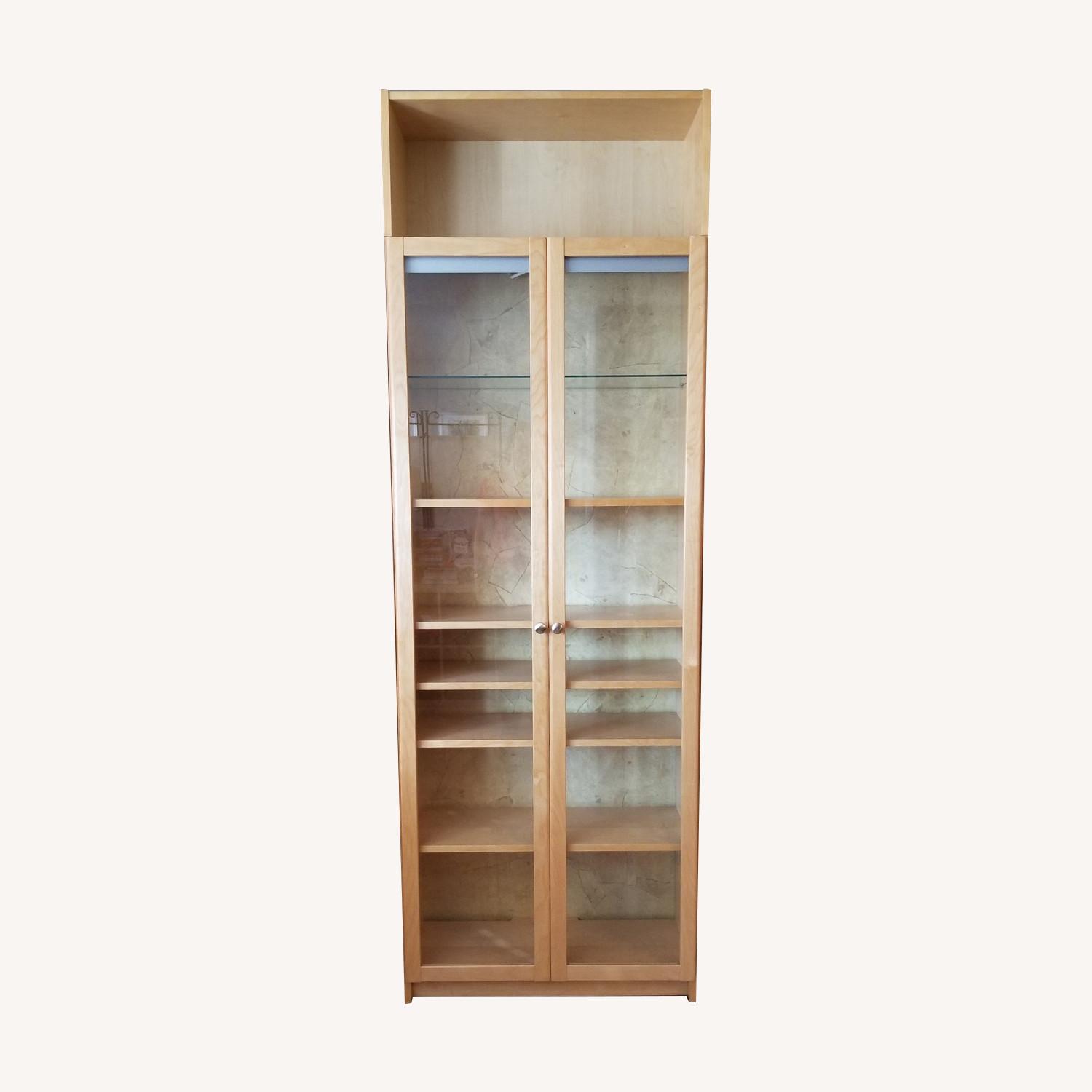 Seller's Notes:2 Bookcases Available - IKEA Birch Billy bookcase upgraded with a 1/4" plywood back that has been faux marble finished (wall paper and polyurethane sealed) and silver tone door knobs. Two full length glass doors protect items on bookcase. Glass doors are similar to current IKEA Oxberg. Main difference is that these doors have rounded sides. Inside mounted light illuminates the top half of bookcase making it lovely to display dishes or artwork. One adjustable glass shelf and three adjustable wood shelves. Four floor protective feet on bottom enable sliding bookcase into place without scratching floor. These bookcases were so well upgraded and assembled, they do not come apart. Main bookcase is 31 1/2" wide x 79 1/2" high x 12" deep with a height extension bringing the total height up to 93" high. Height extension can easy be taken off. Newly purchased components cost over $325 not including labor to create faux marbleized effect on back. Marbleized effect on back is tones of beige and brown with touches of gray. Some slight darkening of birch laminate from sunlight possibly showing where previous shelf was located. A few small holes in sides (approximately 3 each side) from screws securing this bookcase to others for stability. Possibly a couple screw holes in top to secure to wall with an "L" bracket for further stability. In current configuration (see pictures), everyone thinks these are built-ins. They look that great!