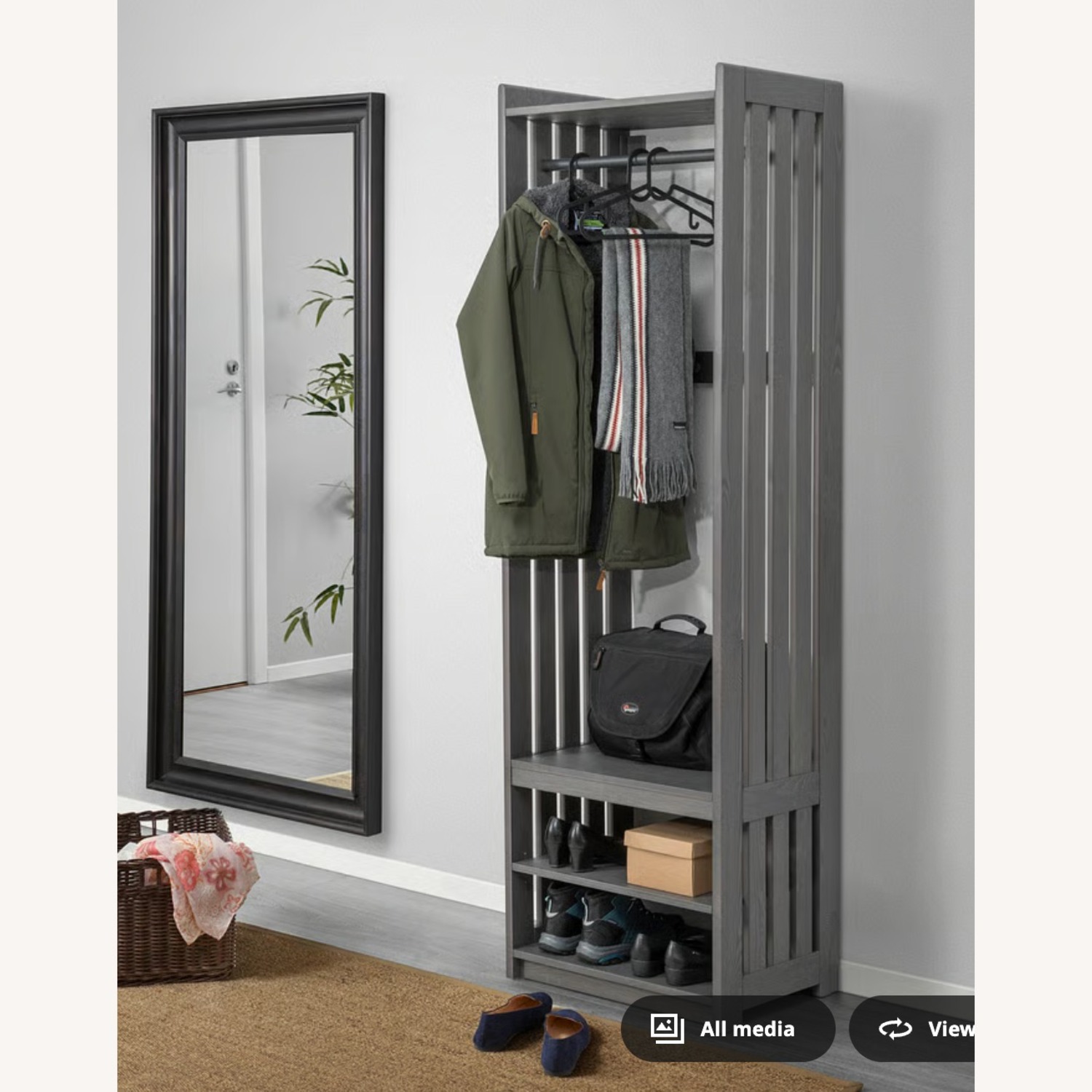 Seller's Notes:This is an almost brand new Ikea coat rack with shoe storage. It is the grey color (the white is just another photo of the style so you can see what it looks like). This was used I can't find any blemishes on it.