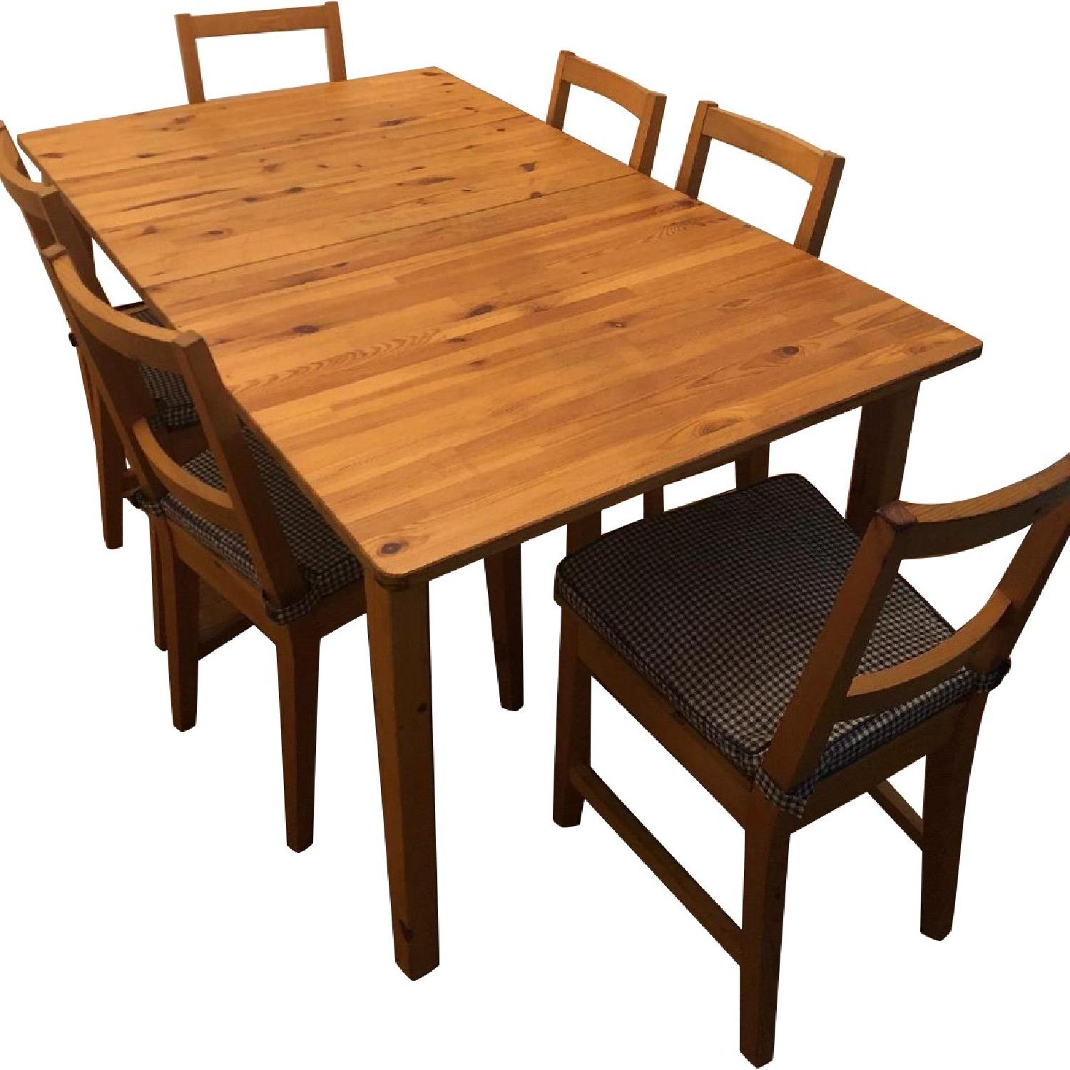 Seller's Notes:Ikea table and 6 chairs. Each chair has padded cover (1 of 6 chairs has small stain on pad). Table is extendable and includes extra leaflet. Still in good condition and ready to use! Moving to a new apartment and can't fit it.
