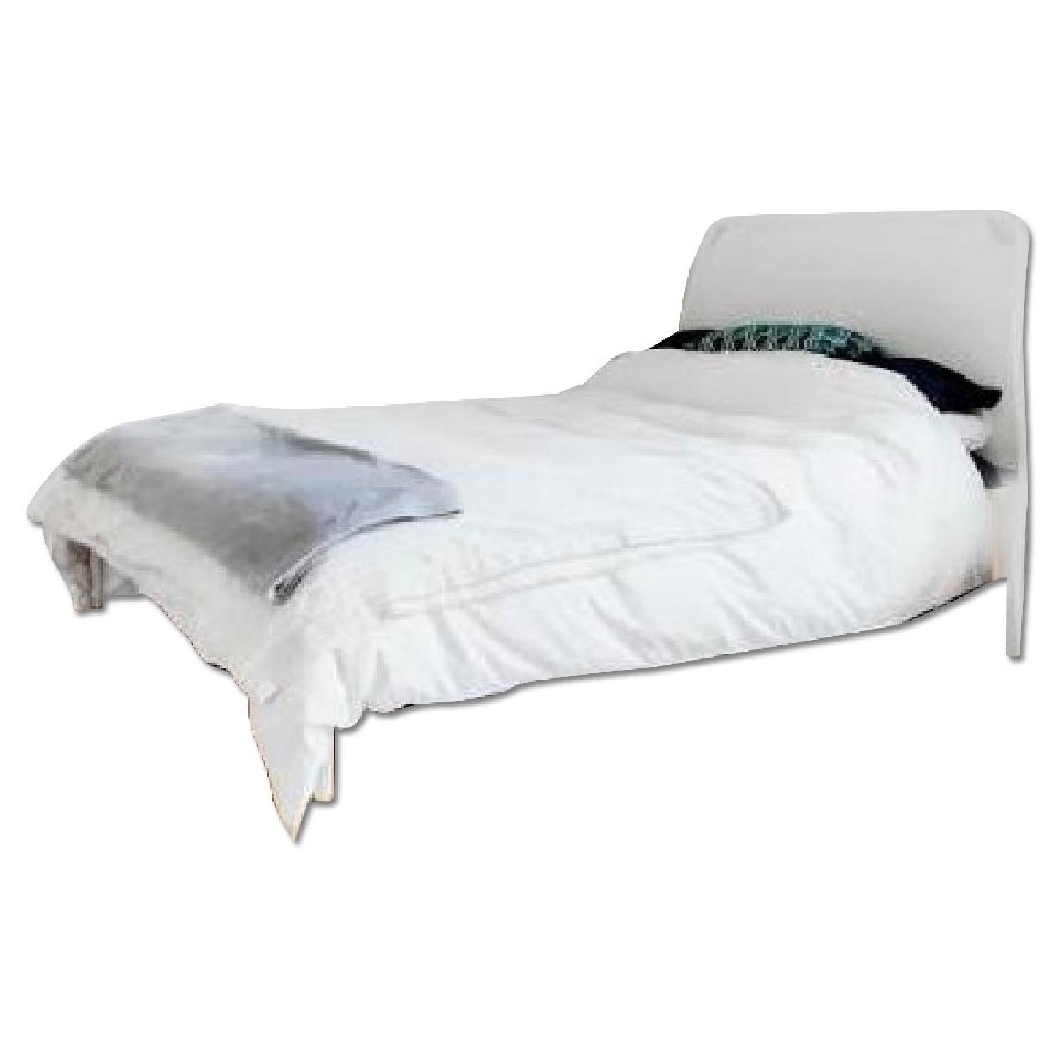 Seller's Notes:Graduating from university, so moving back home. Need to give away my bed frame. - White modern bed frame, comes with all the parts (Base,screws) - Some scratches on frame from moving/storage